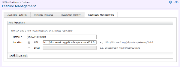 4. Enter any name for the repository (eg: WSO2MainRepo) and provide the URL https://dist.wso2.org/p2/carbon/releases/3.2.0. Then click the Add button to apply the settings.