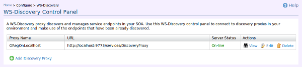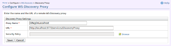 8. Enter any name for the discovery proxy (eg: GRegOnLocalhost) and enter the URL https://localhost:9773/services/DiscoveryProxy. Click 'Save' to apply the settings. You will be taken back to the WS-Discovery Control Panel which will list the discovery proxy you just configured. If GReg is already running, server status will be shown as On-line.