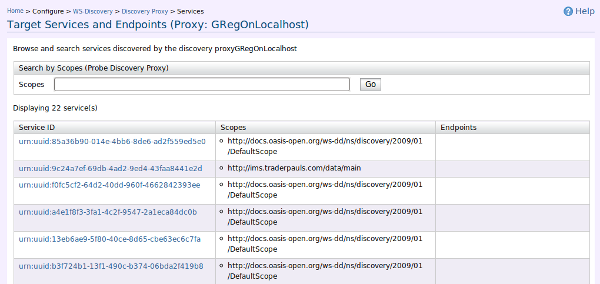 </proxy>We are done configuring the PriceFinder proxy service with security. In the process we also specified a scope for the service. Head over to the WS-Discovery Control Panel in the 'Configure' tab and search for the scope https://public.ims.traderpauls.com/sales/pricing. The PriceFinder proxy will be listed as the only hit which means the proxy service has been successfully discovered by GReg. Note that the service has only a HTTPS endpoint. When we applied UsernameToken security on the proxy service, the ESB disabled the HTTP endpoint of the service. ESB does not expose UsernameToken secured services over HTTP.