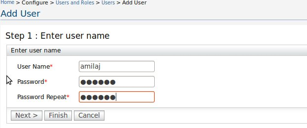 To add users, go to Configure → Users and Roles → Users → Add New User For this example I am going to create a user called “amilaj” with password “wsxwsx”.