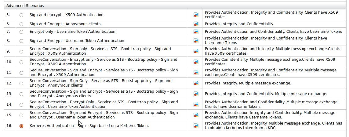For this example lets secure “echo” service with Kerberos security. Go to service listing page and select “echo” service. Main → Web Services → List → echo. Select “Security” and enable security. Select security scenario 16.
