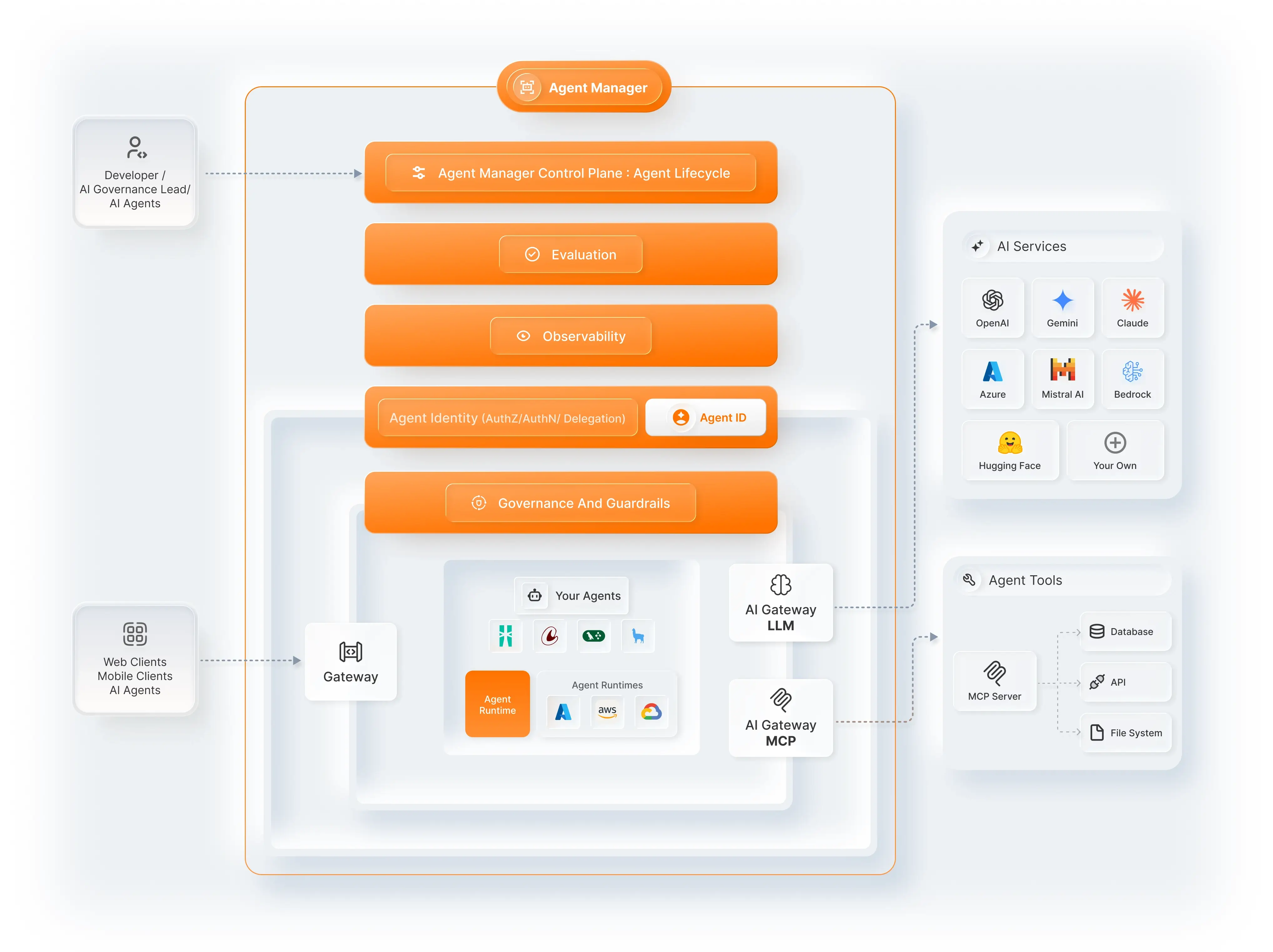 Trace agent activity, run continuous evaluations to maintain and improve quality, and add governance through guardrails and policies on any agent, LLM, and MCP interaction.