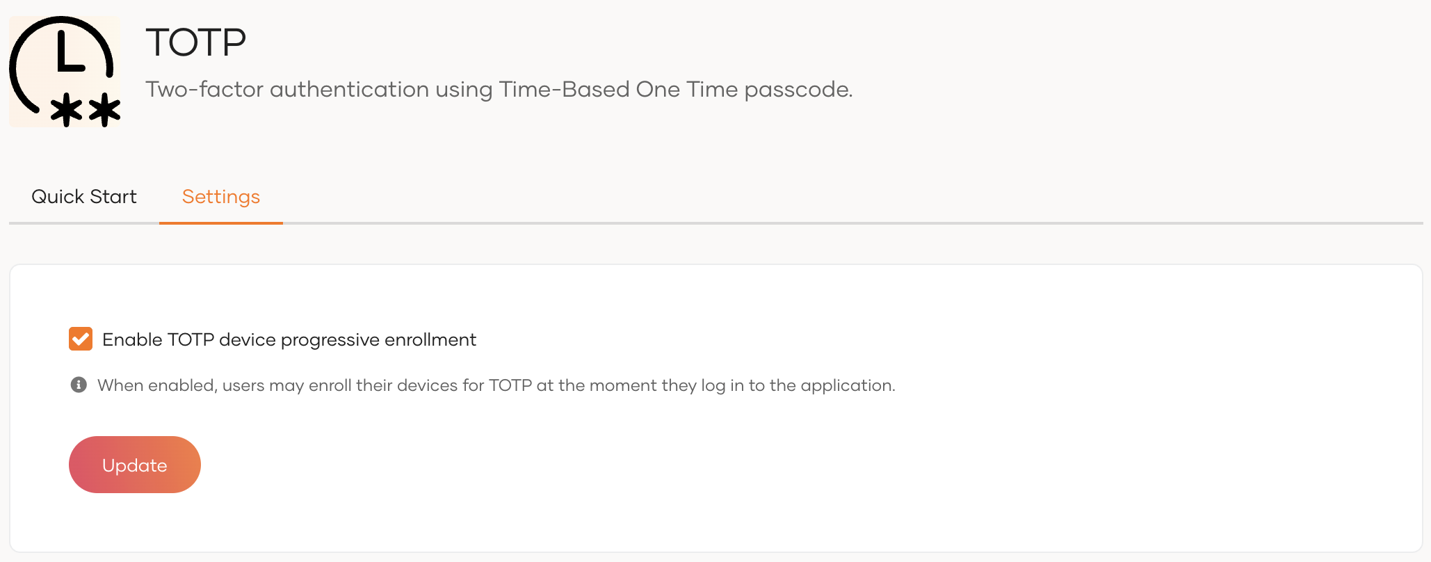 Use the Enable TOTP progressive enrollment toggle to control the enrollment behavior: