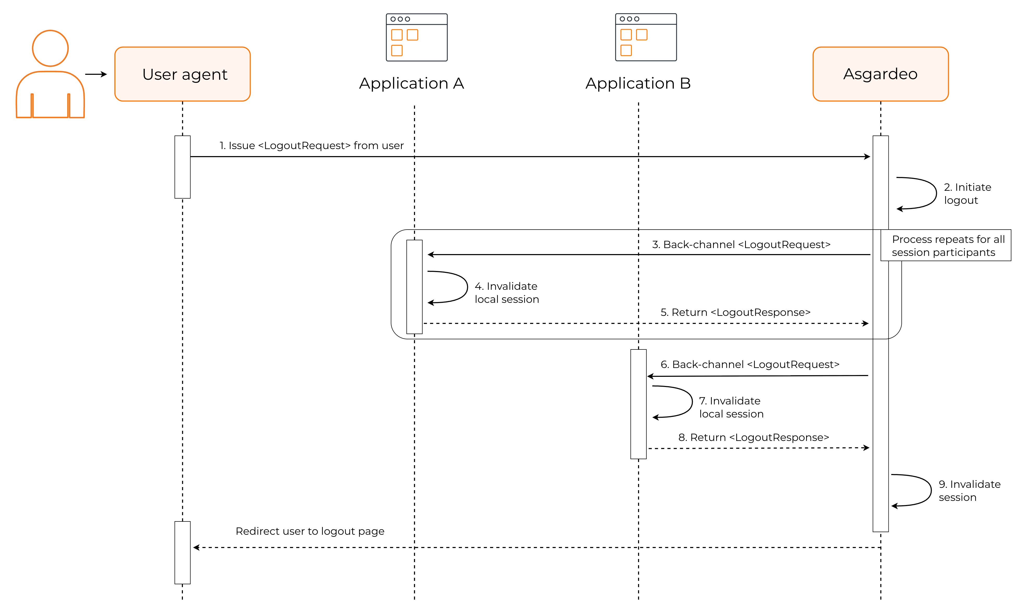 Back-channel logout provides a reliable and consistent logout across all applications as it depends on direct server-to-server communication rather than relying on the user's browser. The following diagrams explain the two use cases for which you can use back-channel logout.