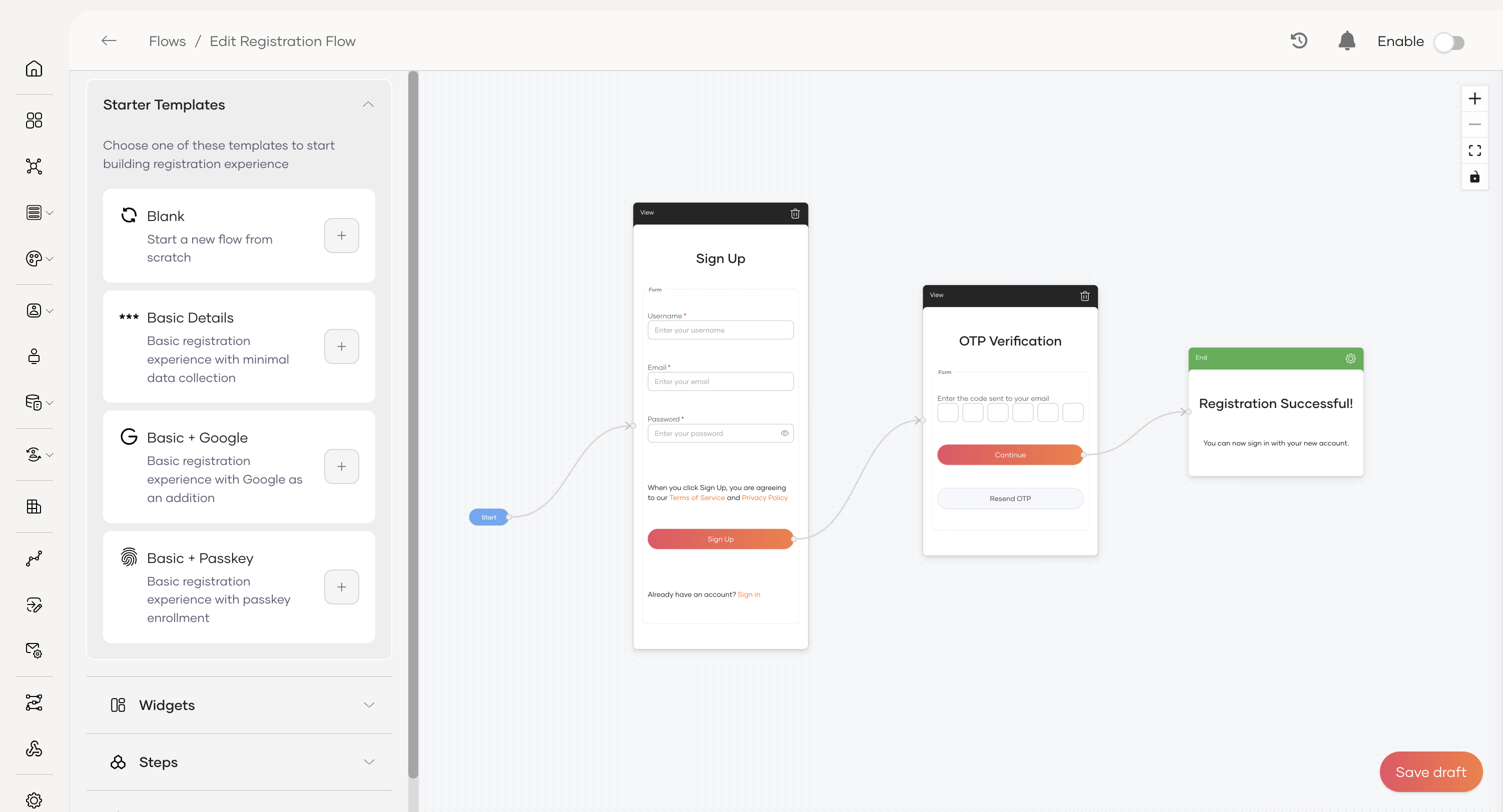 For specific examples of building flows, refer to Self-registration, Password recovery, and Invited user registration. To execute the flows from a custom client application, see Use the Flow Execution API and explore the view schema in Understand Flow Execution Components.