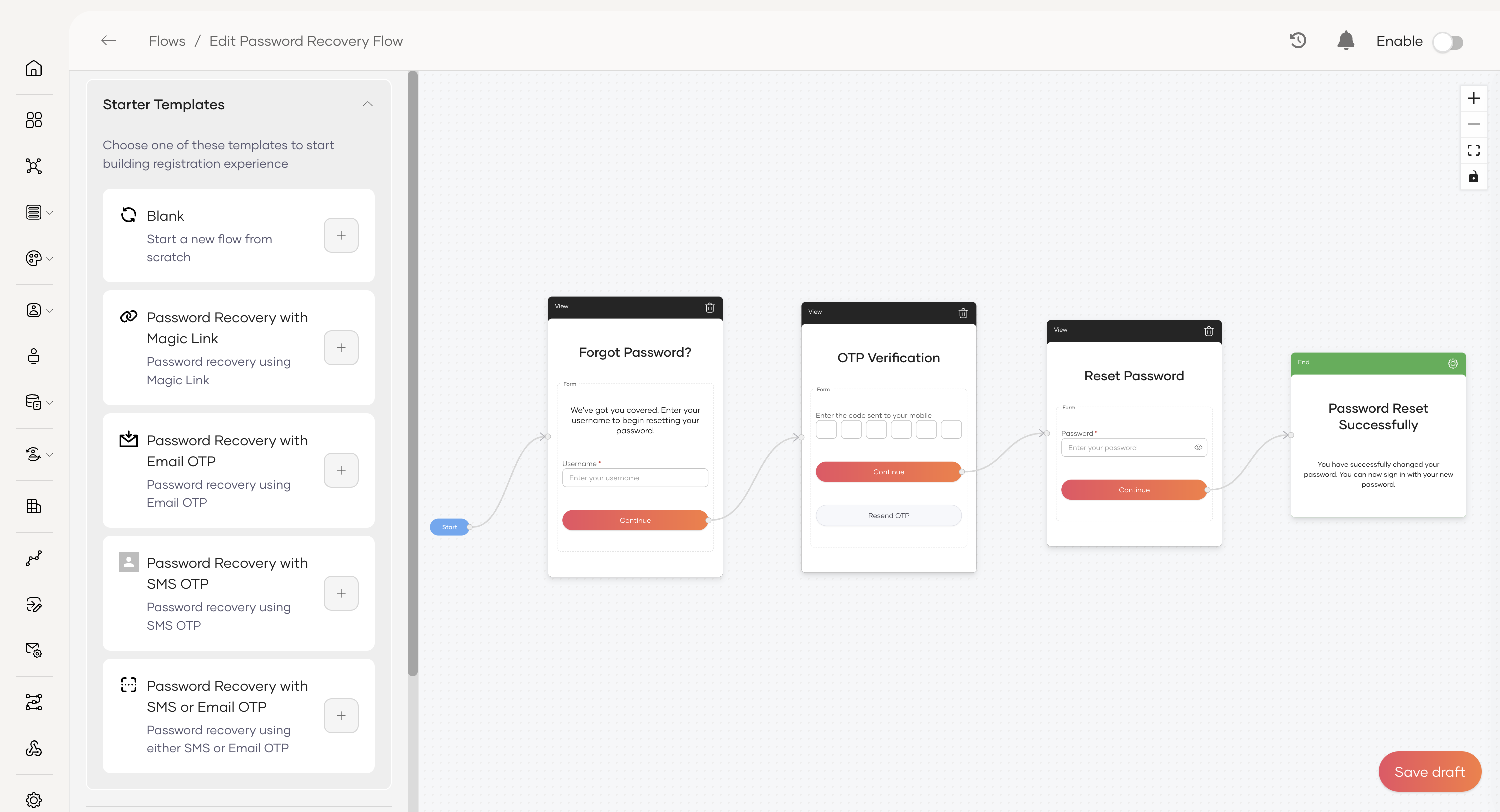In the Flow Builder, you can create the password recovery journey in two ways: