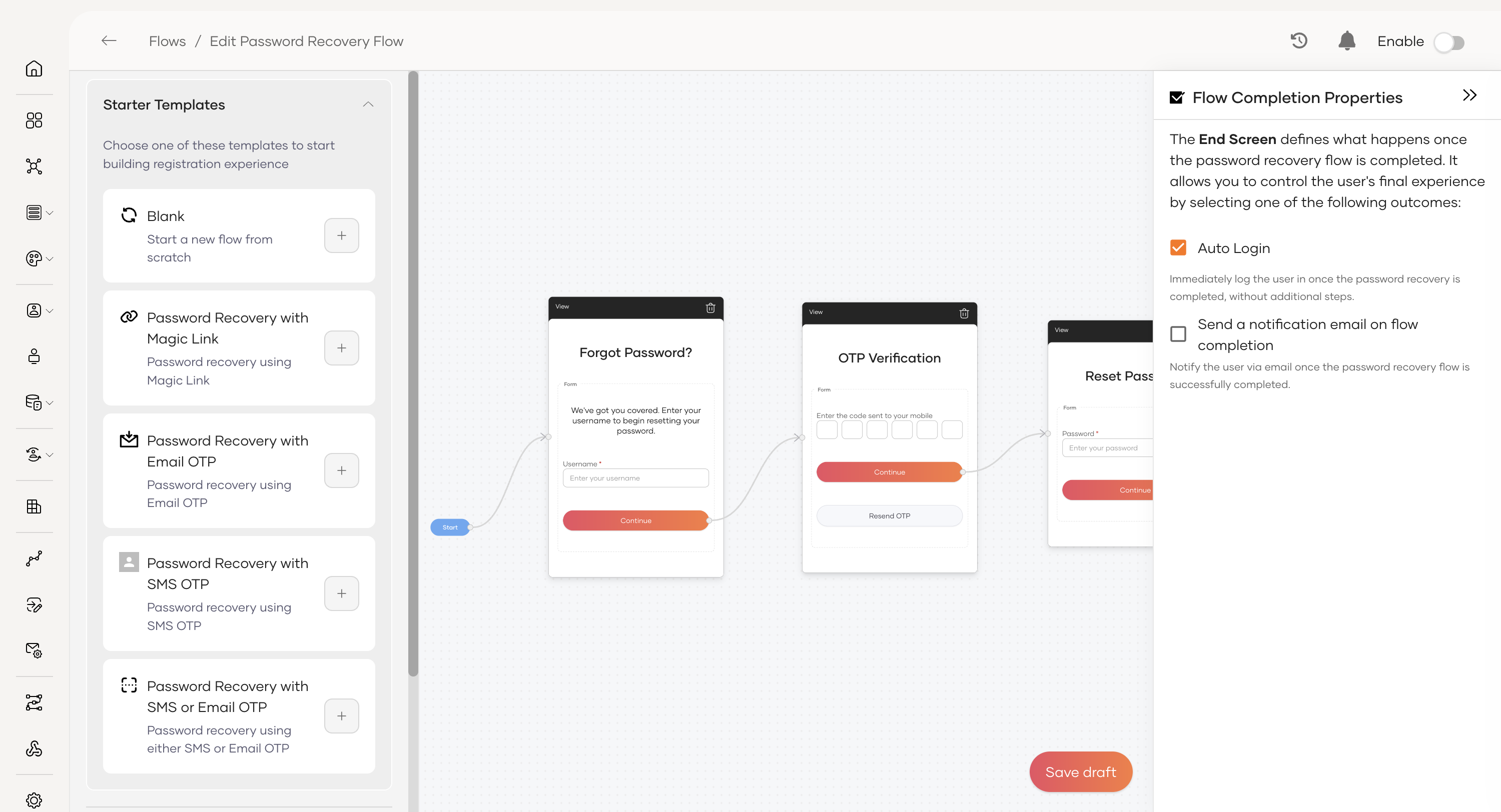 - Send a notification email on flow completion: When enabled, the user will receive an email confirming that their password recovery is complete and their account is ready to use.