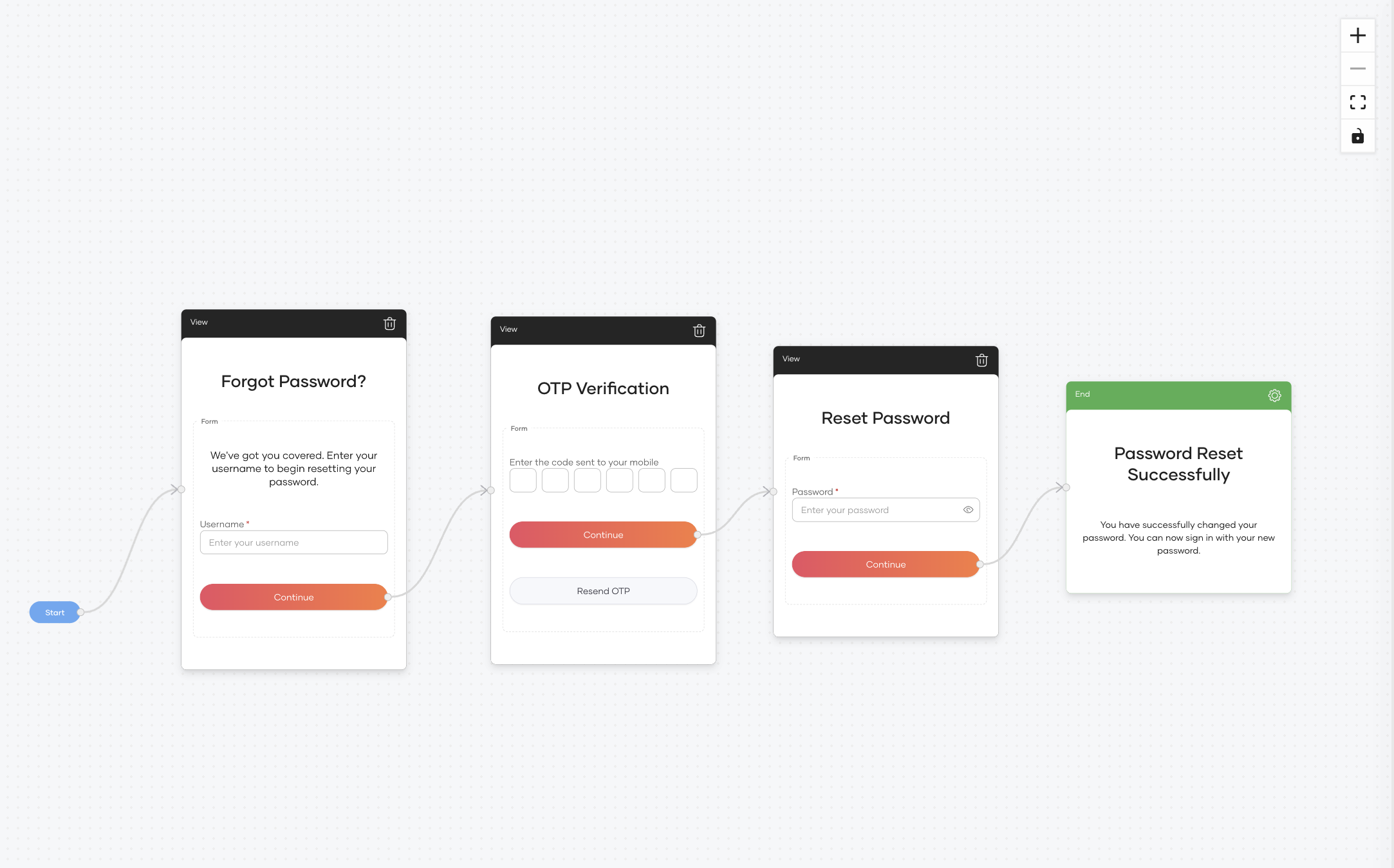 Imagine you want to verify the user’s identity via SMS OTP before allowing them to reset their password. The flow works as follows: