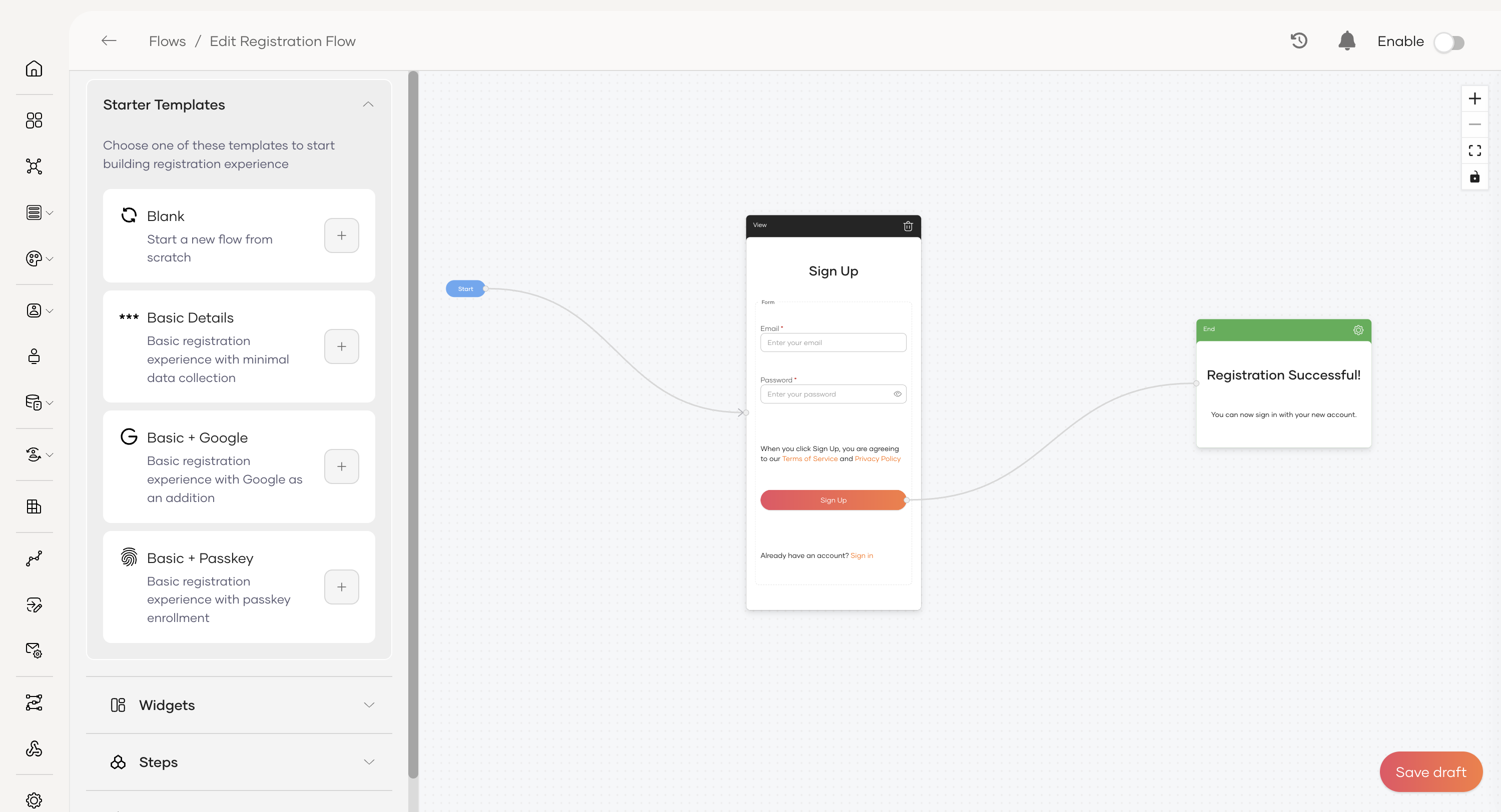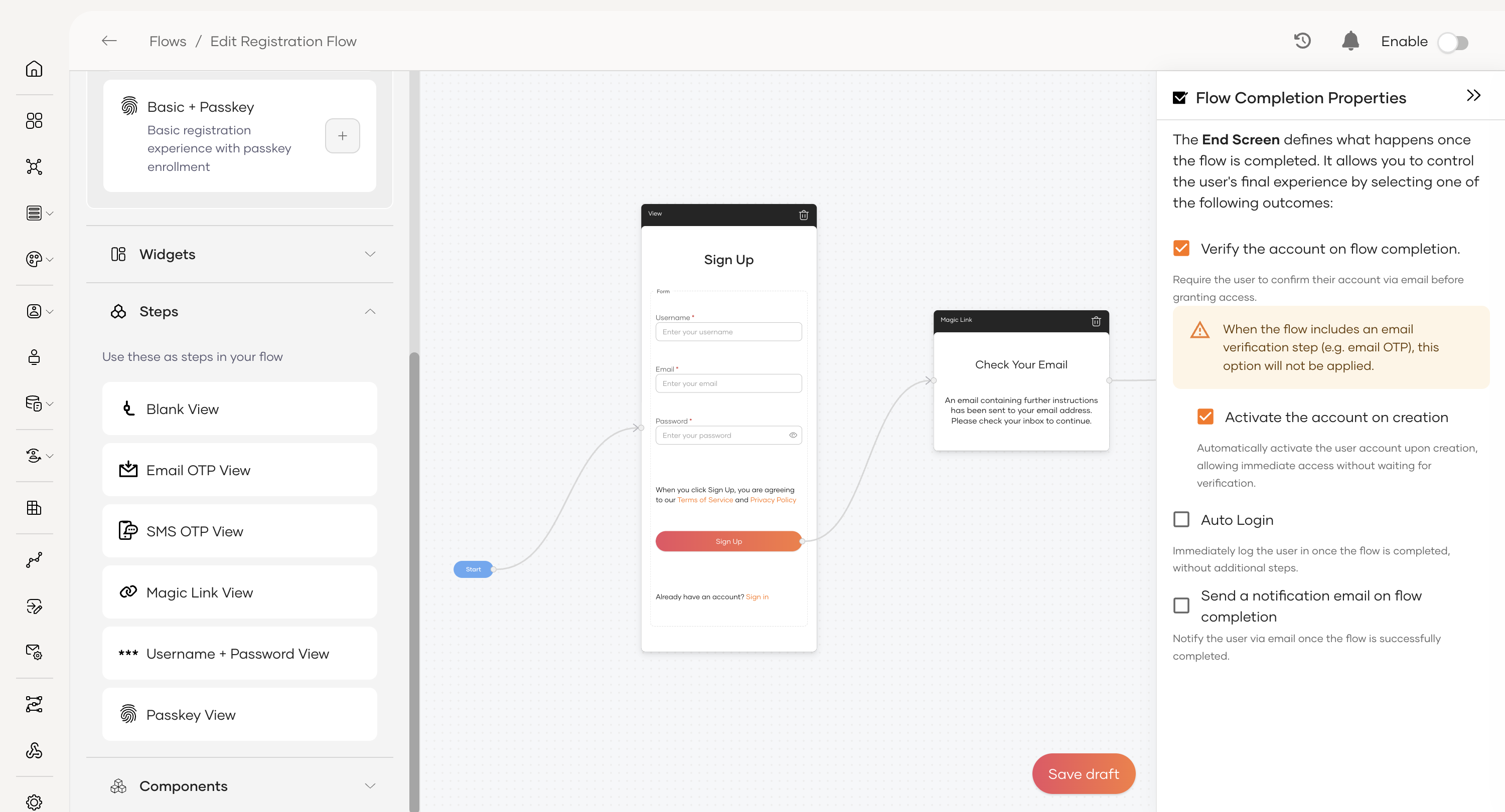 Send a notification email on flow completion: When enabled, the user will receive an email confirming that their account has been successfully created.