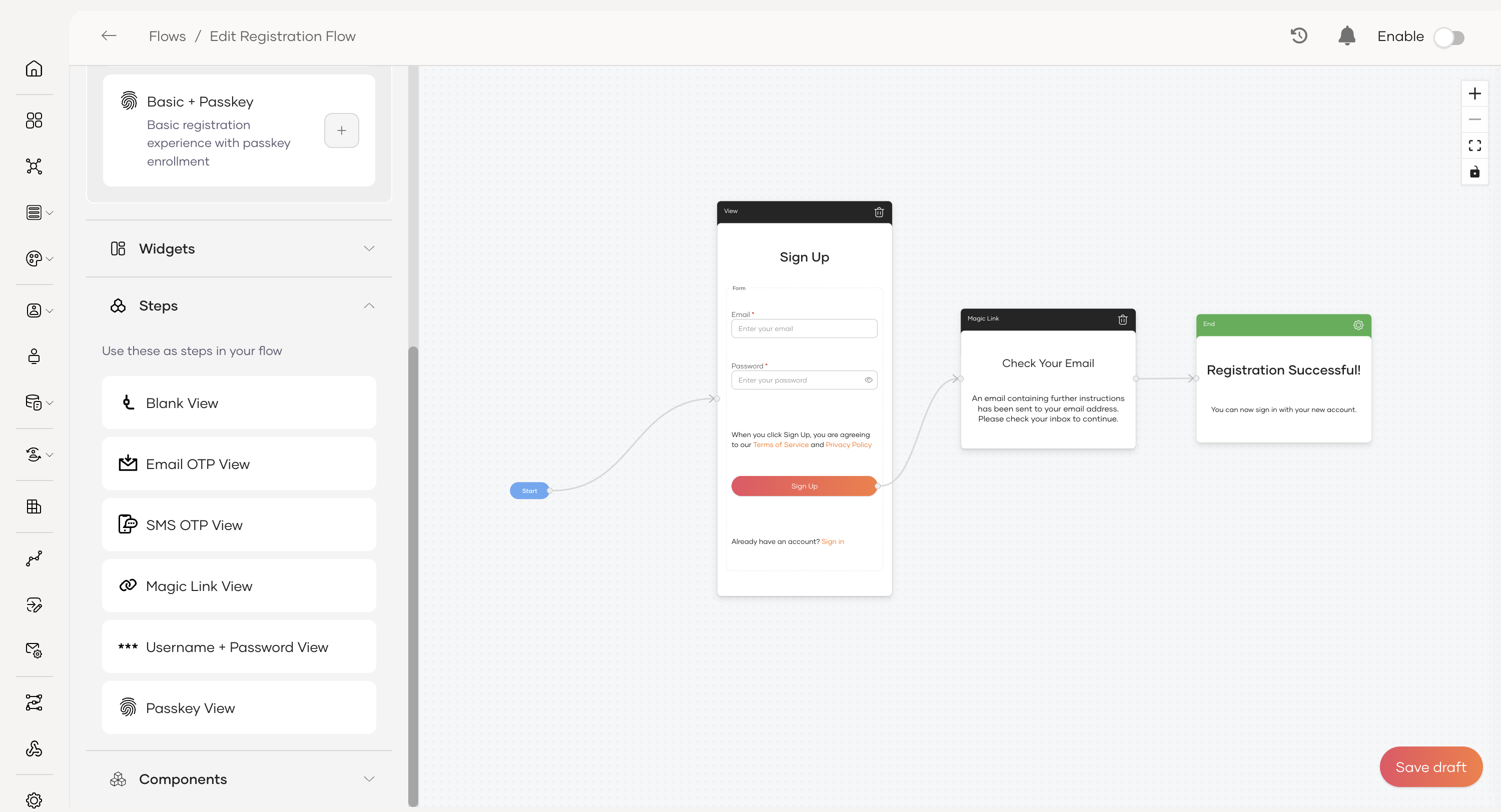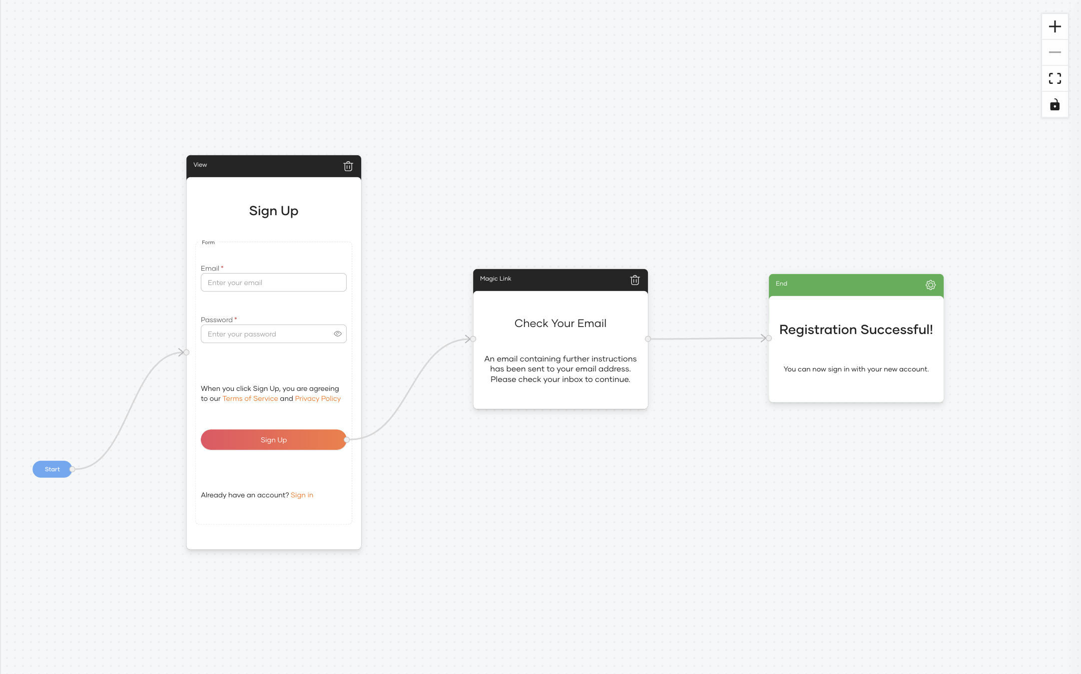 - Draw a final connection from the Verify button (inside the Magic Link step) to the End node.
