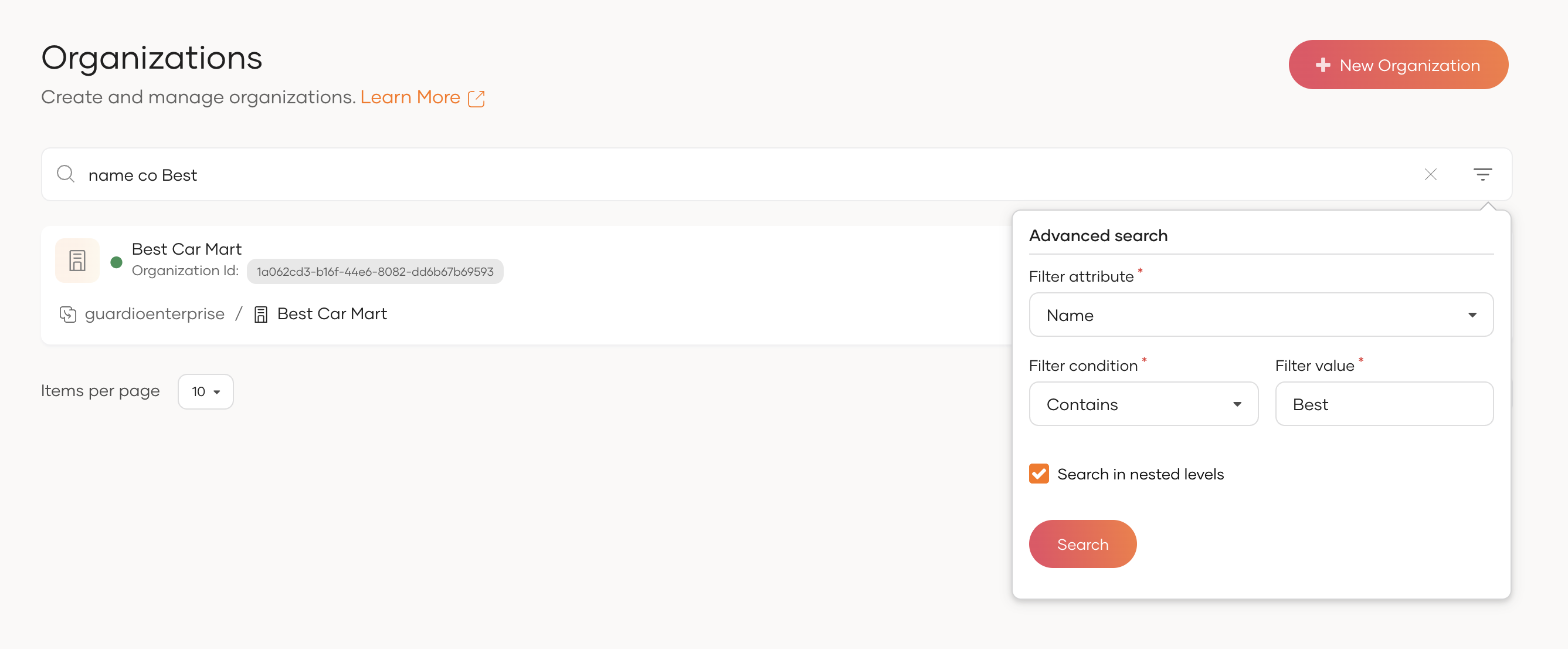 By checking the Search in nested levels checkbox in the Advanced Search Dropdown, you can search for an organization in the nested levels instead of just the immediate level organizations.