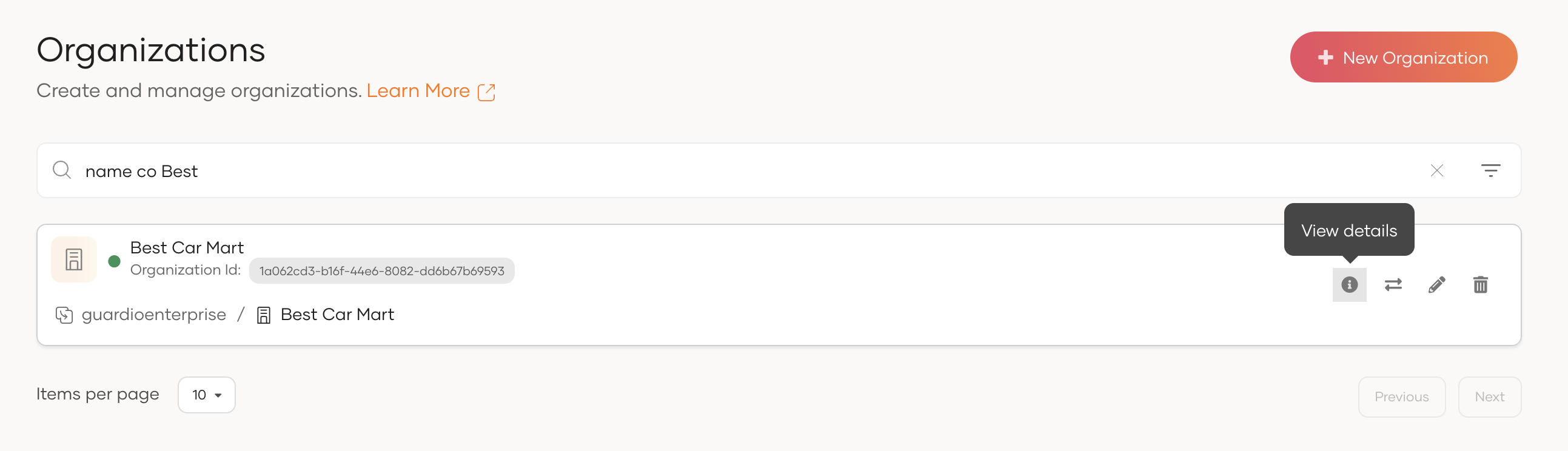 Click the View details icon of the search result to view the exact path where the organization exists.