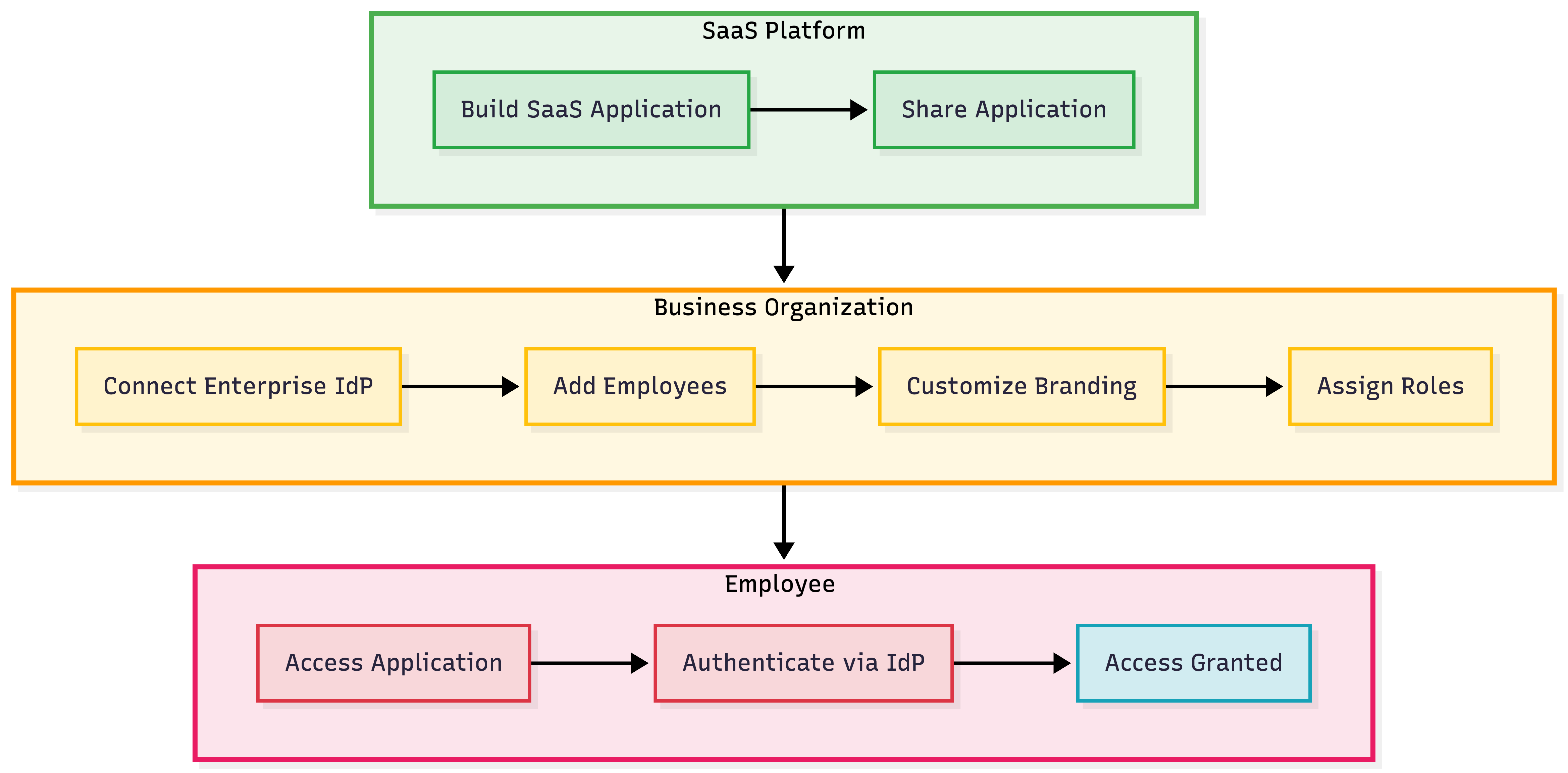 You run a SaaS platform where businesses sign up to use your software. Each business becomes an organization with its own isolated user management, custom branding, security rules, and can plug in their own enterprise identity provider.