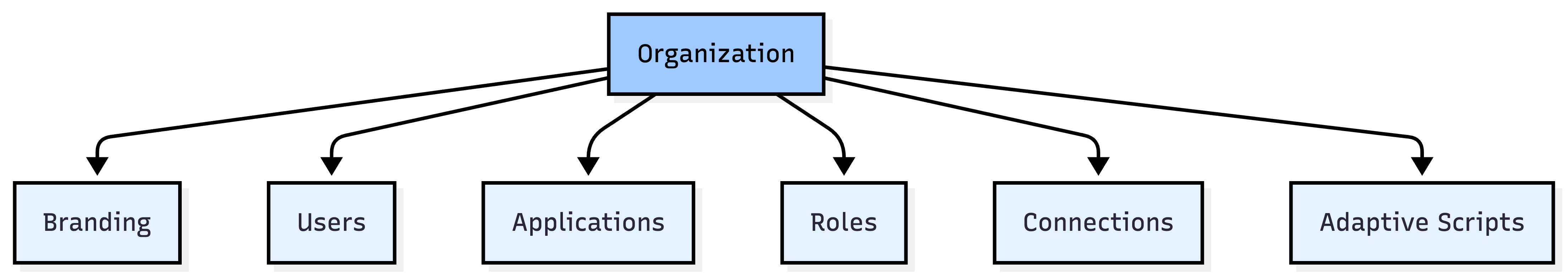 | Resources | Applications, Roles (with shared apps), Users | Connections (IdPs), Users, Applications, Groups, Roles, Branding, Templates, Workflows, Userstores, User attributes, Flows, Login and registration customizations, Actions, Adaptive scripts | API resources, Parent branding (when the organization doesn't configure branding), Login and registration settings, Custom claims and OIDC scopes |