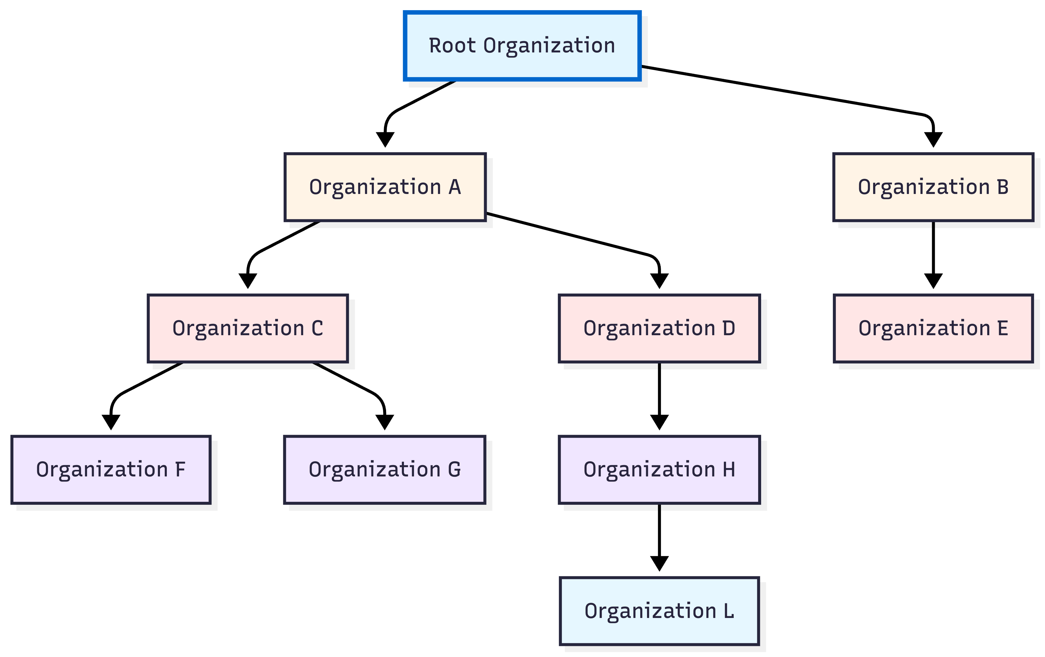 - Root organization - The top-level organization. You create and manage all organizations from here.