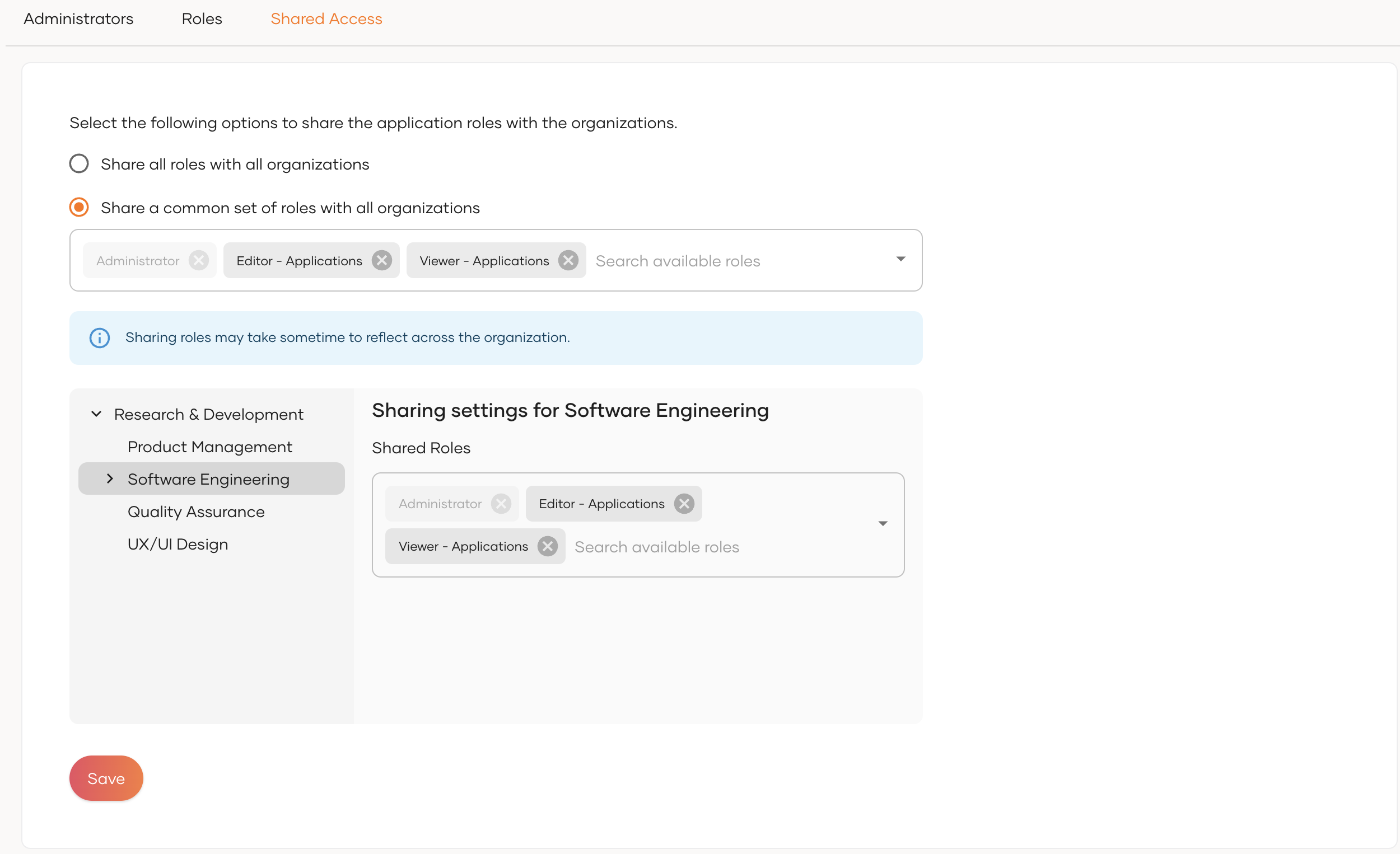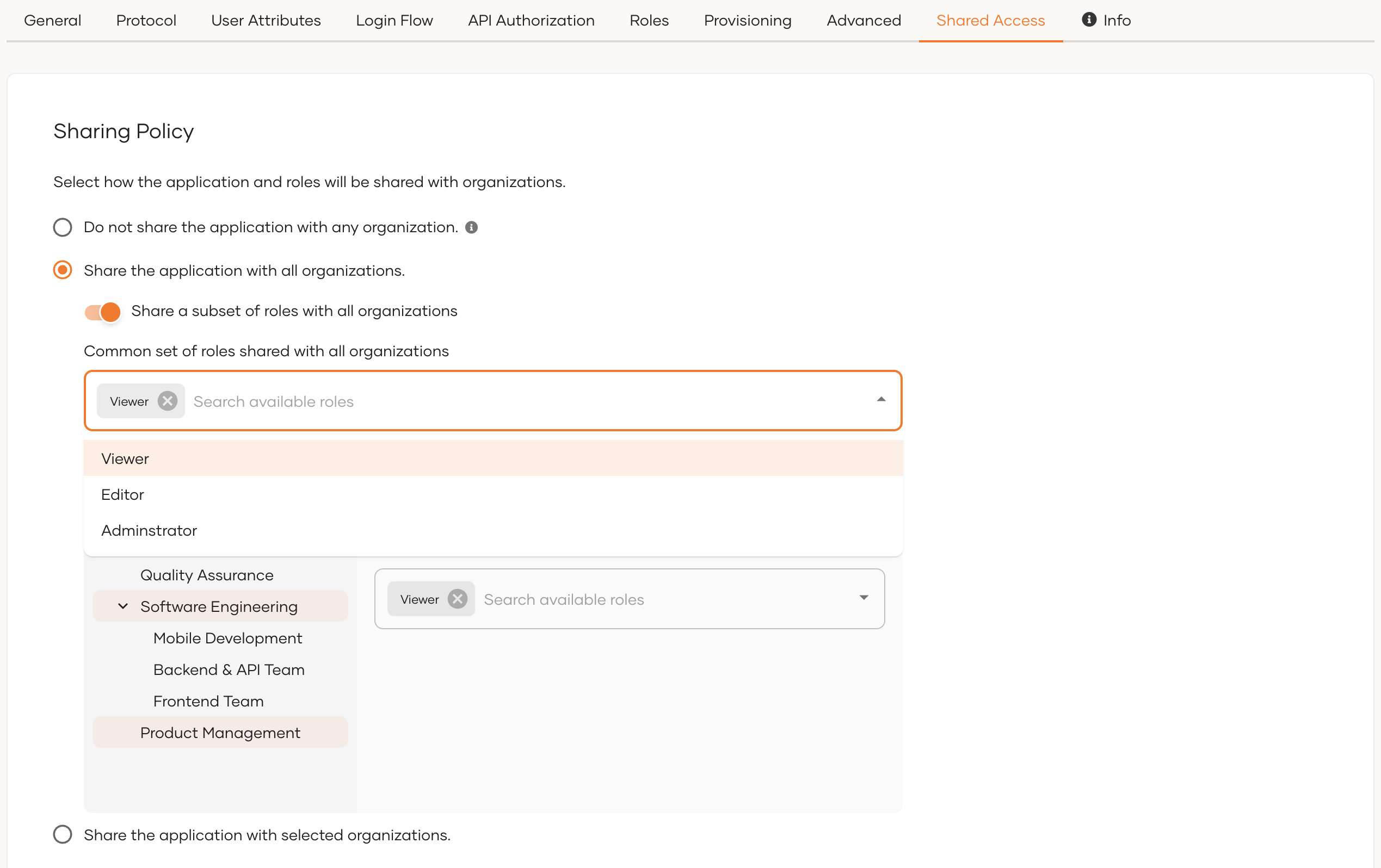 Why use advanced mode? This gives you precise control over application access. You select which roles to share initially, and these become the default for all organizations. Later, you can customize access by adding or removing specific roles for individual organizations.