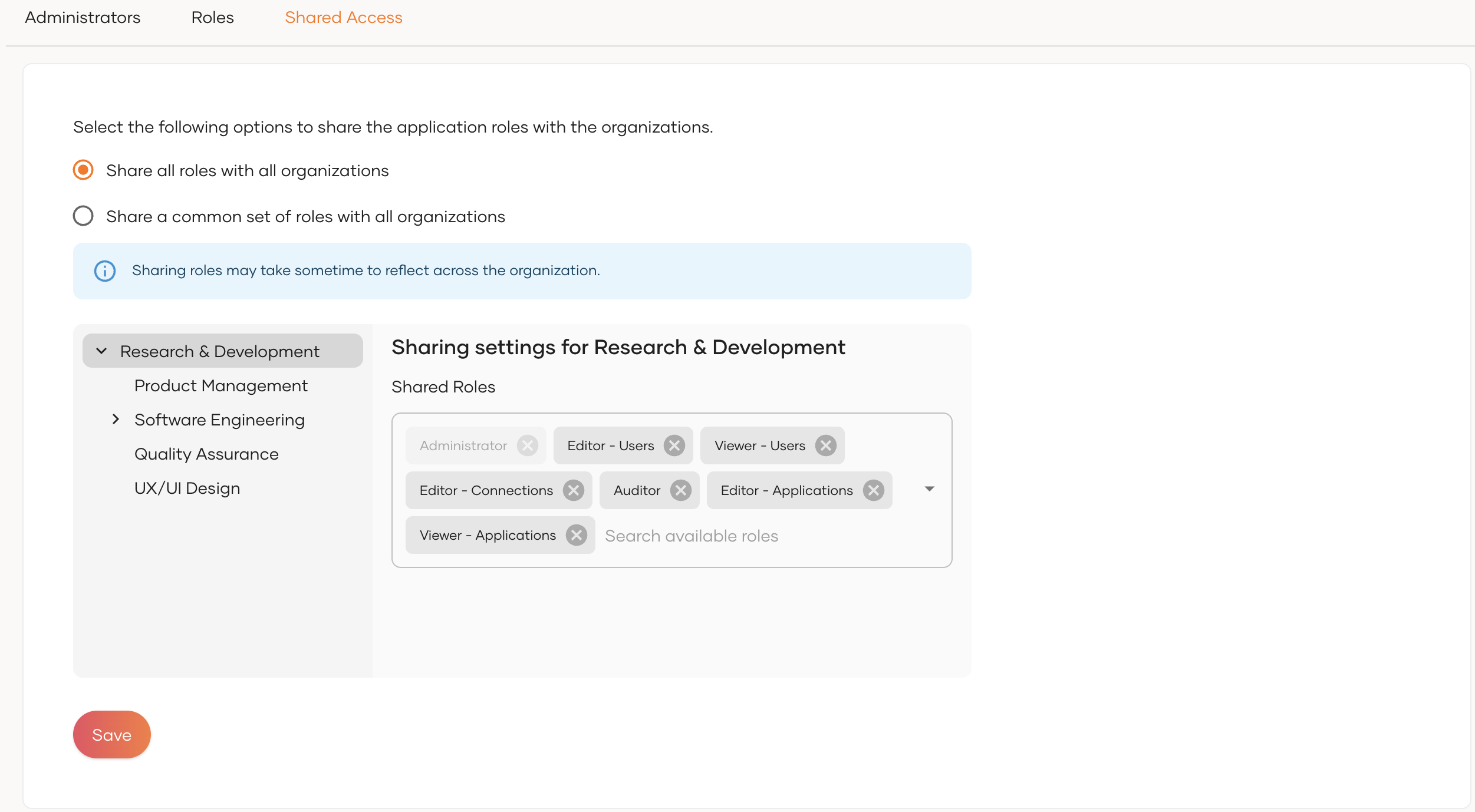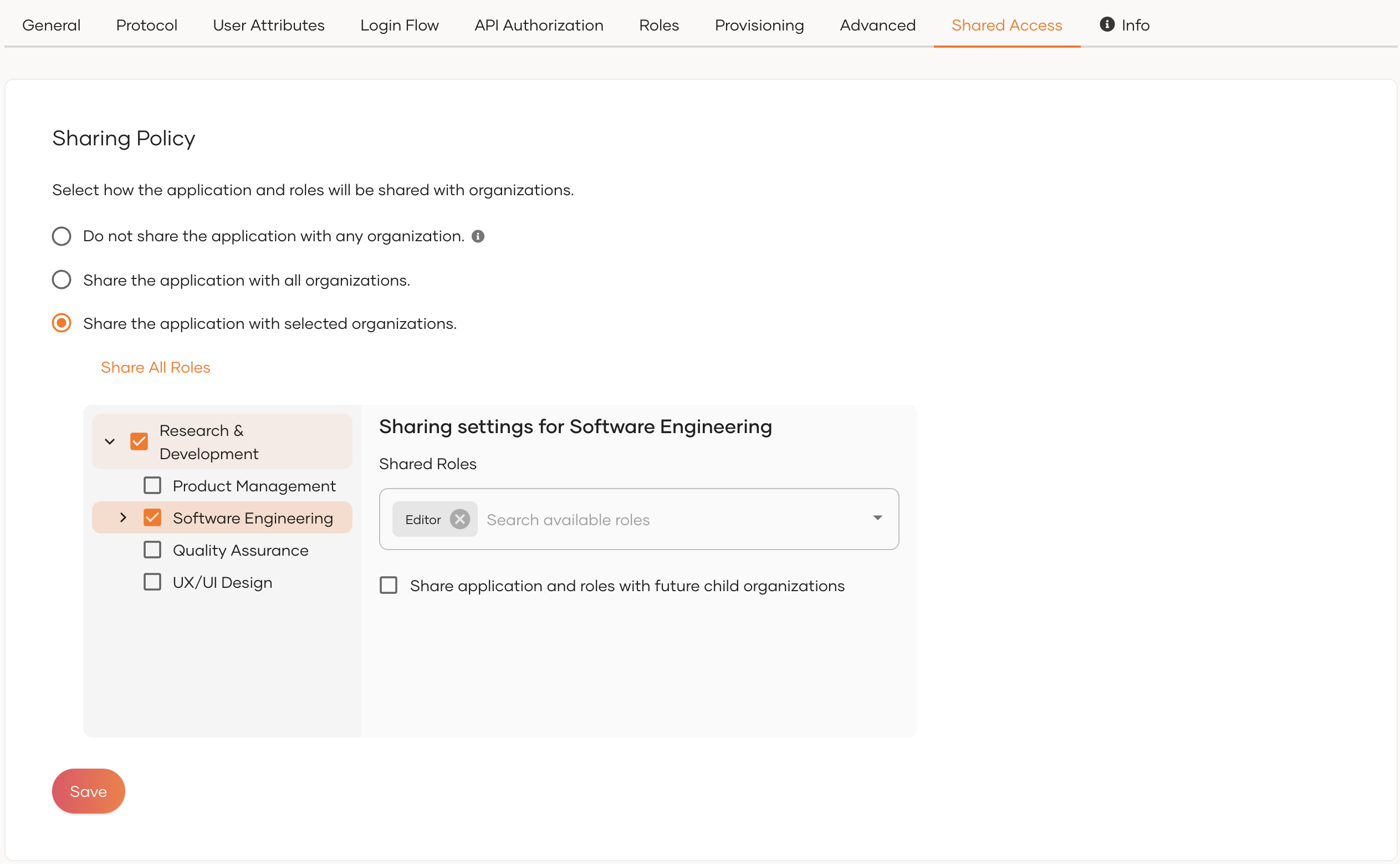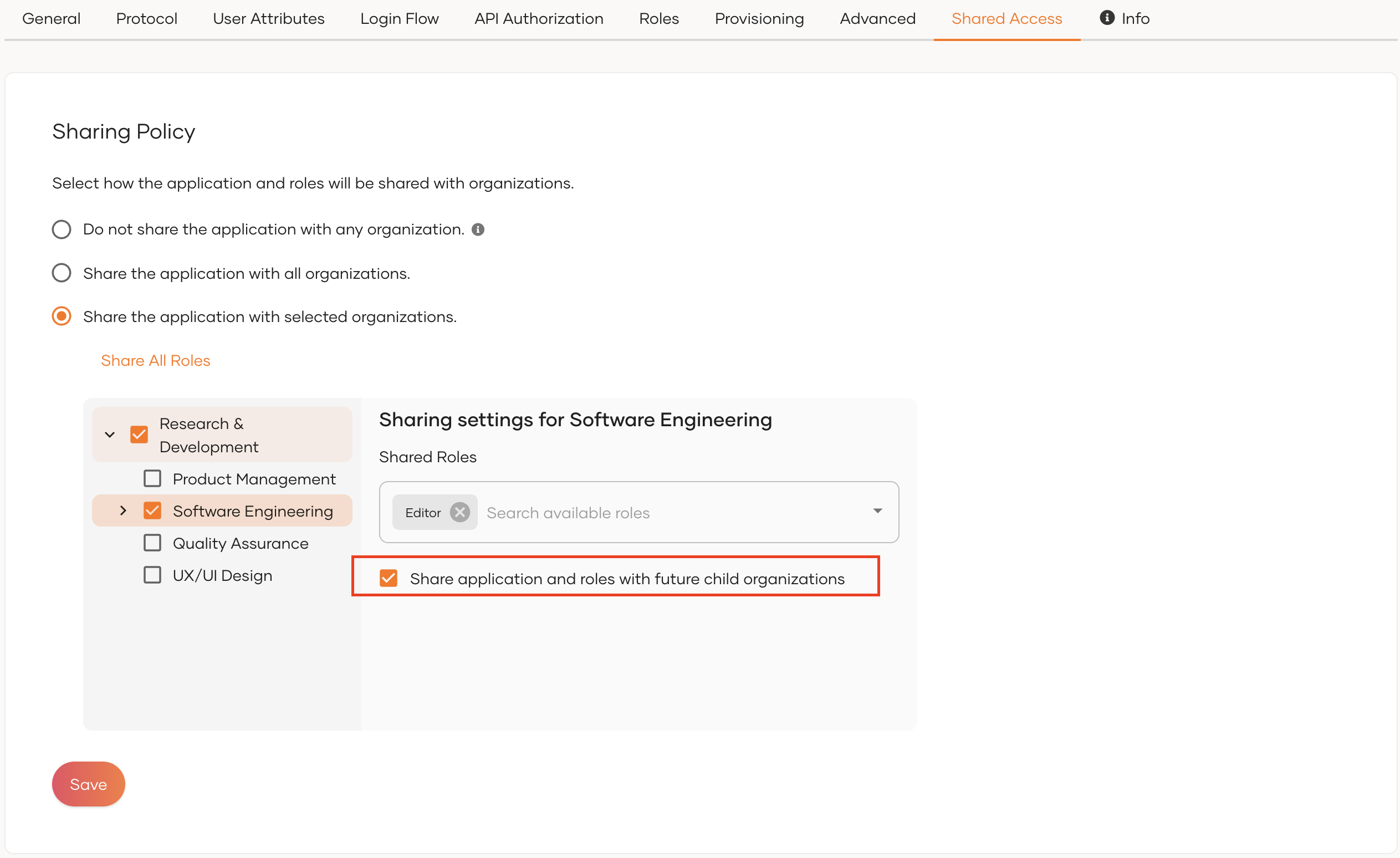 Enable Share application and roles with future child organizations to automatically share with new child organizations under your selected organization.