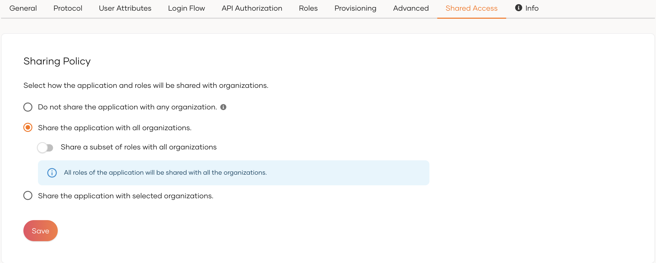 Select Share with all organizations for the application to be shared with all existing organizations and new organizations you may create in the future. Refer Share application with all organizations for more details.