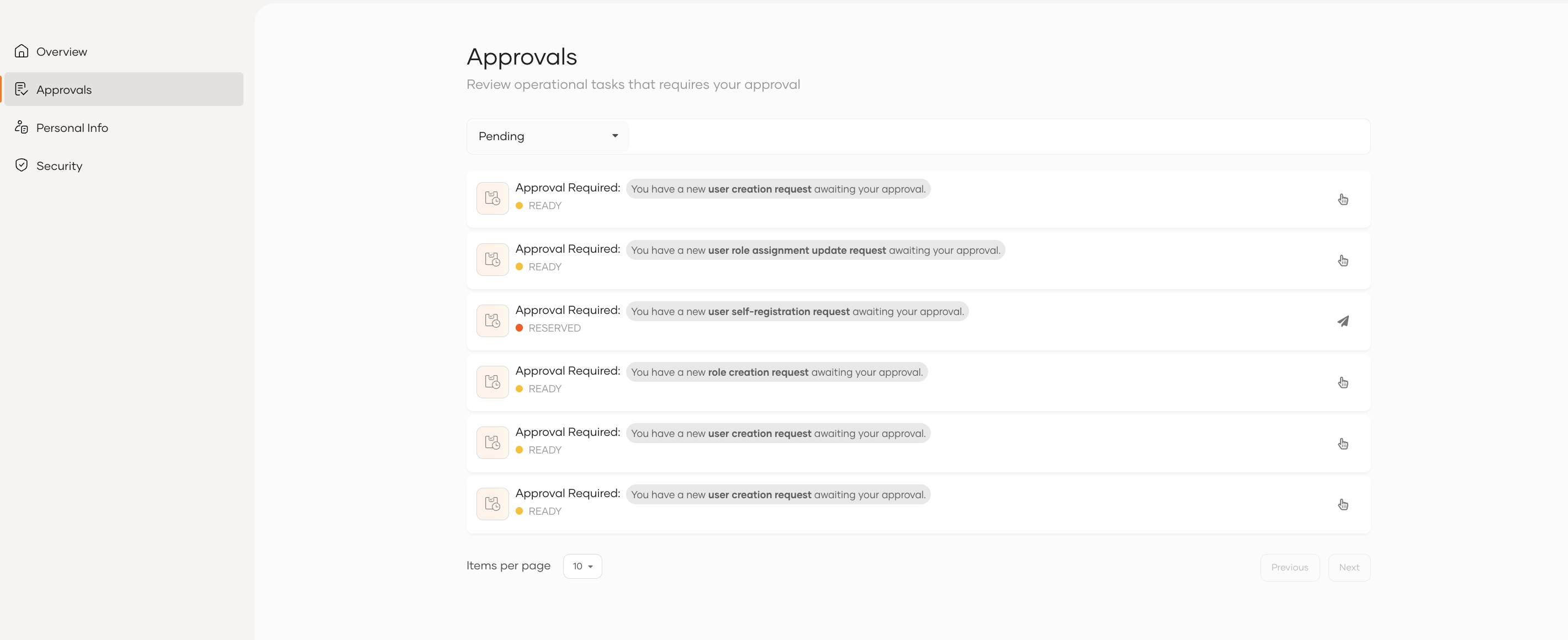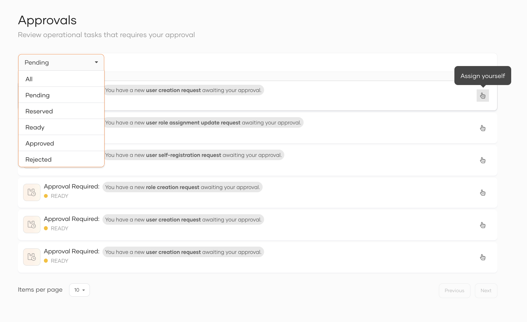 - Ready: The approval request is available for assignment. You can either approve it immediately or reserve it for review later.