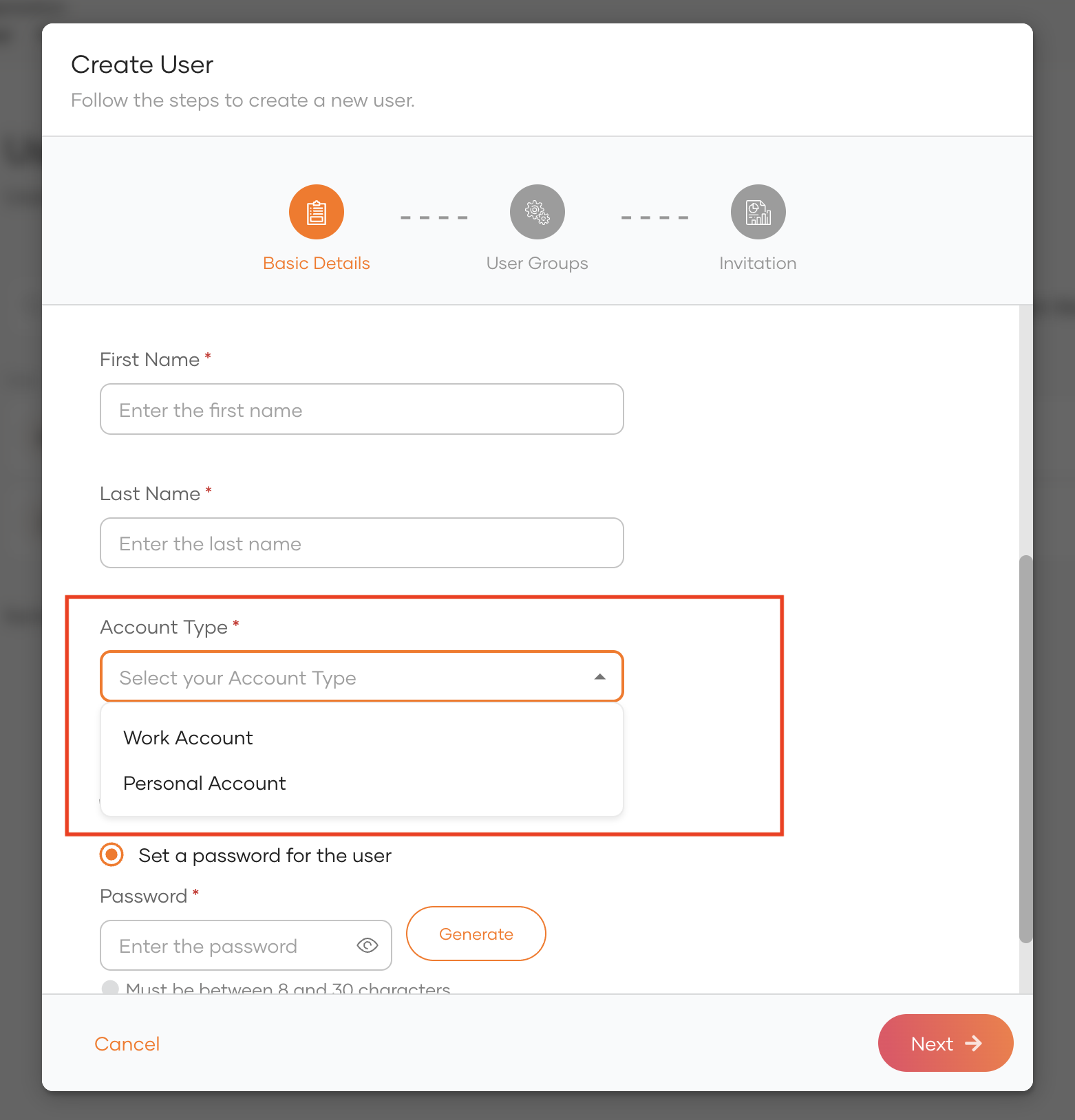 For example, if you set data type to Options and select Dropdown as the input format, the configured values appear as a list in the user creation wizard as shown below.