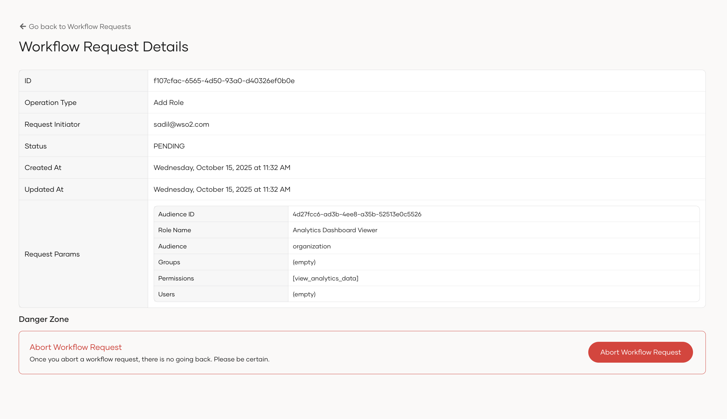 - Pending: The workflow request is pending and waiting for approval.