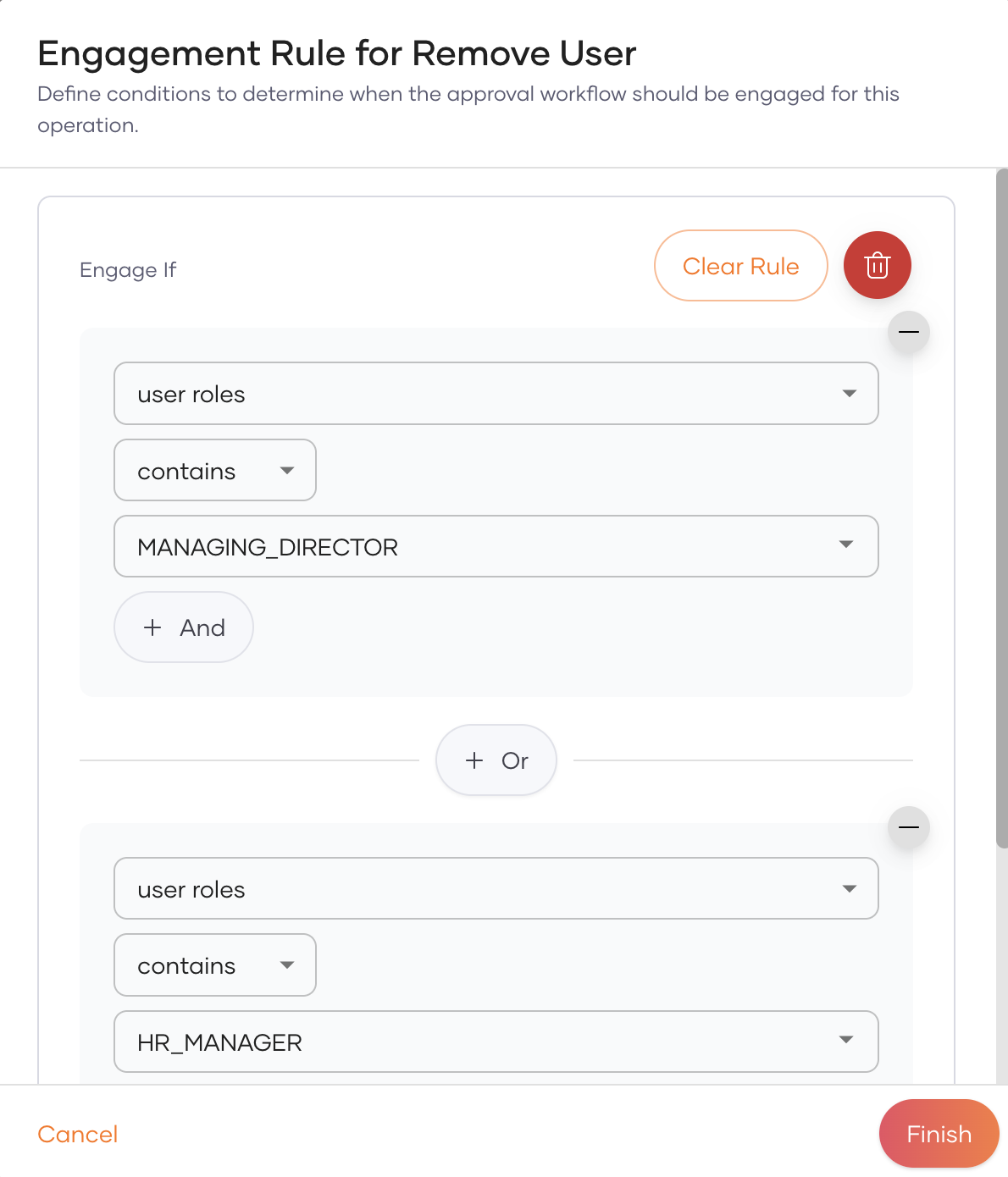 Consider an organization that requires approval for user removal only if the user belongs to the HR_MANAGER or MANAGING_DIRECTOR roles. To configure this: