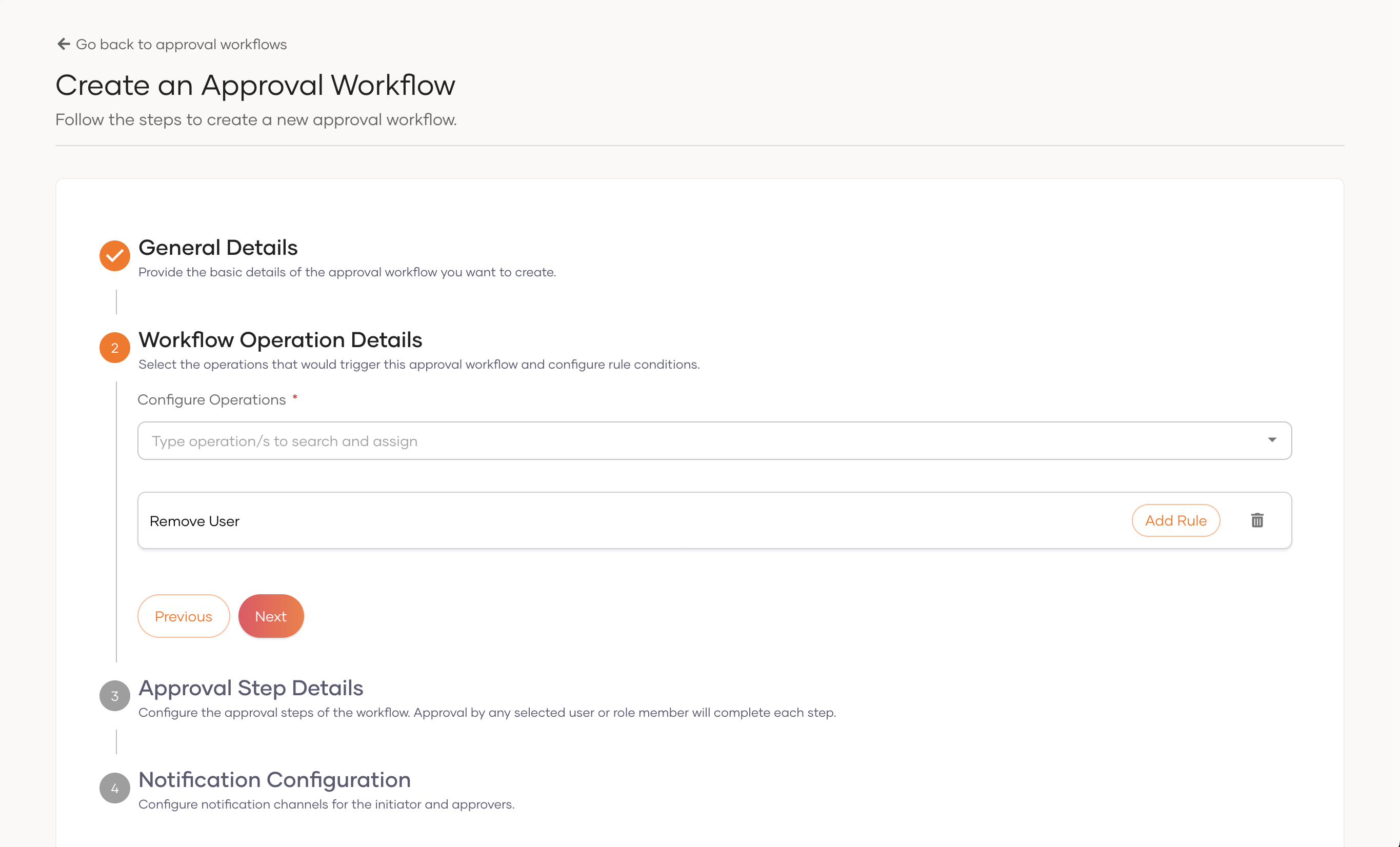 - In the Workflow Operation Details step, add the operations that require approval.