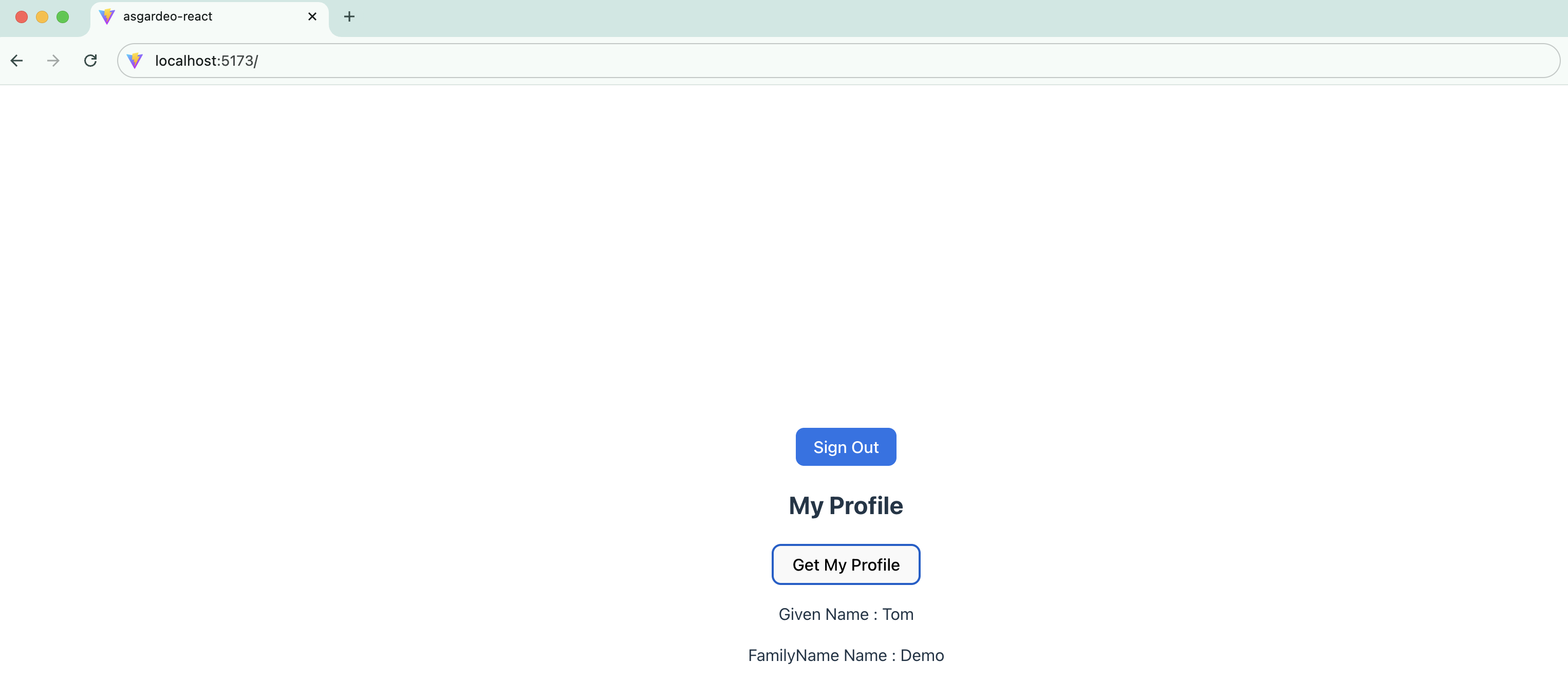 Once you authenticate with your test user credentials, you will be redirected back to the application, and your test user profile will be displayed, as shown in the screenshot below.