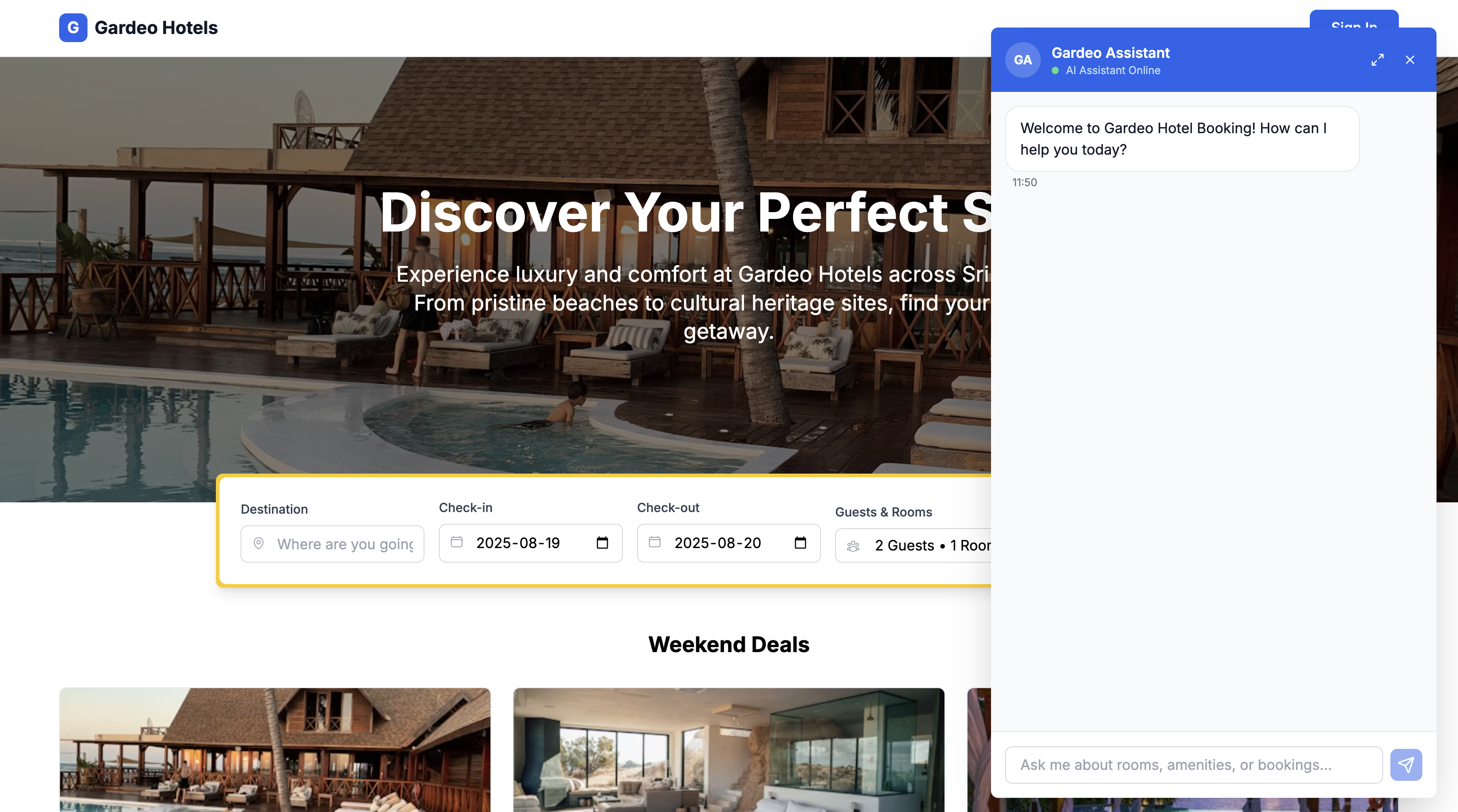 This starts all four components on their respective ports. Once the services are running, access the Gardeo Hotel application at http://localhost:3000.