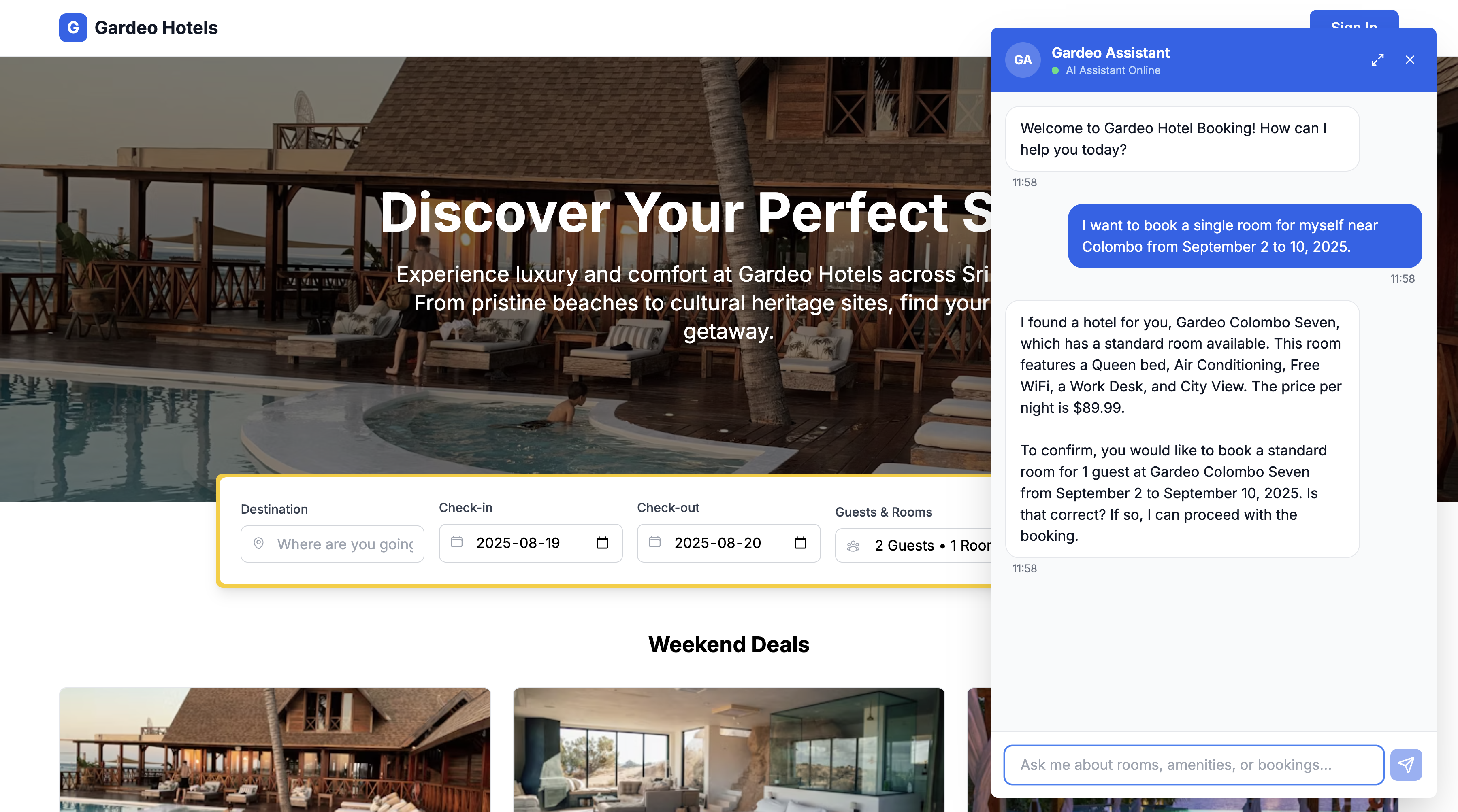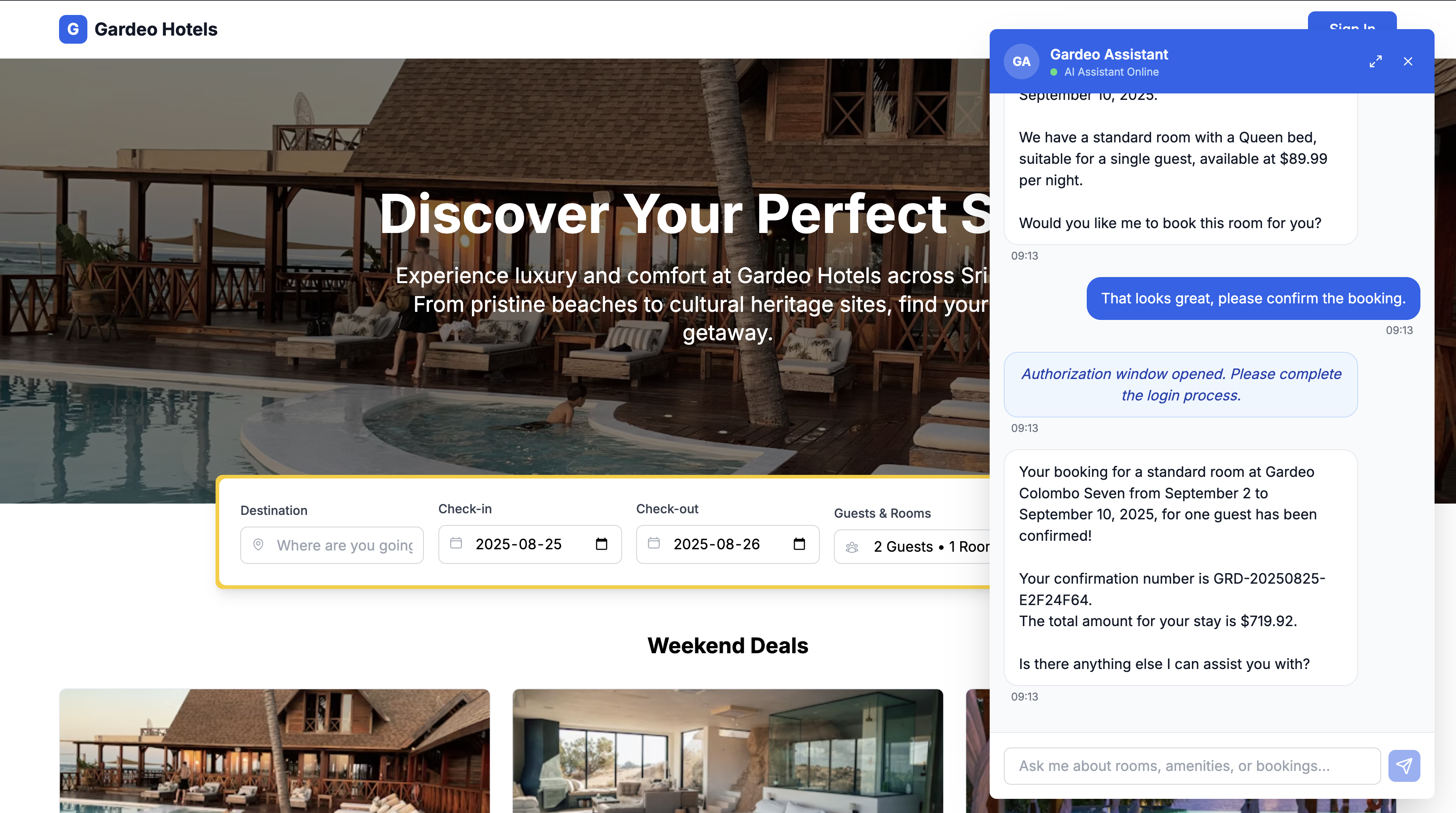 - Frontend Web Application: The user interface for searching, booking, and viewing reservations. It handles user authentication with Asgardeo and provides the chat interface for the AI assistant.