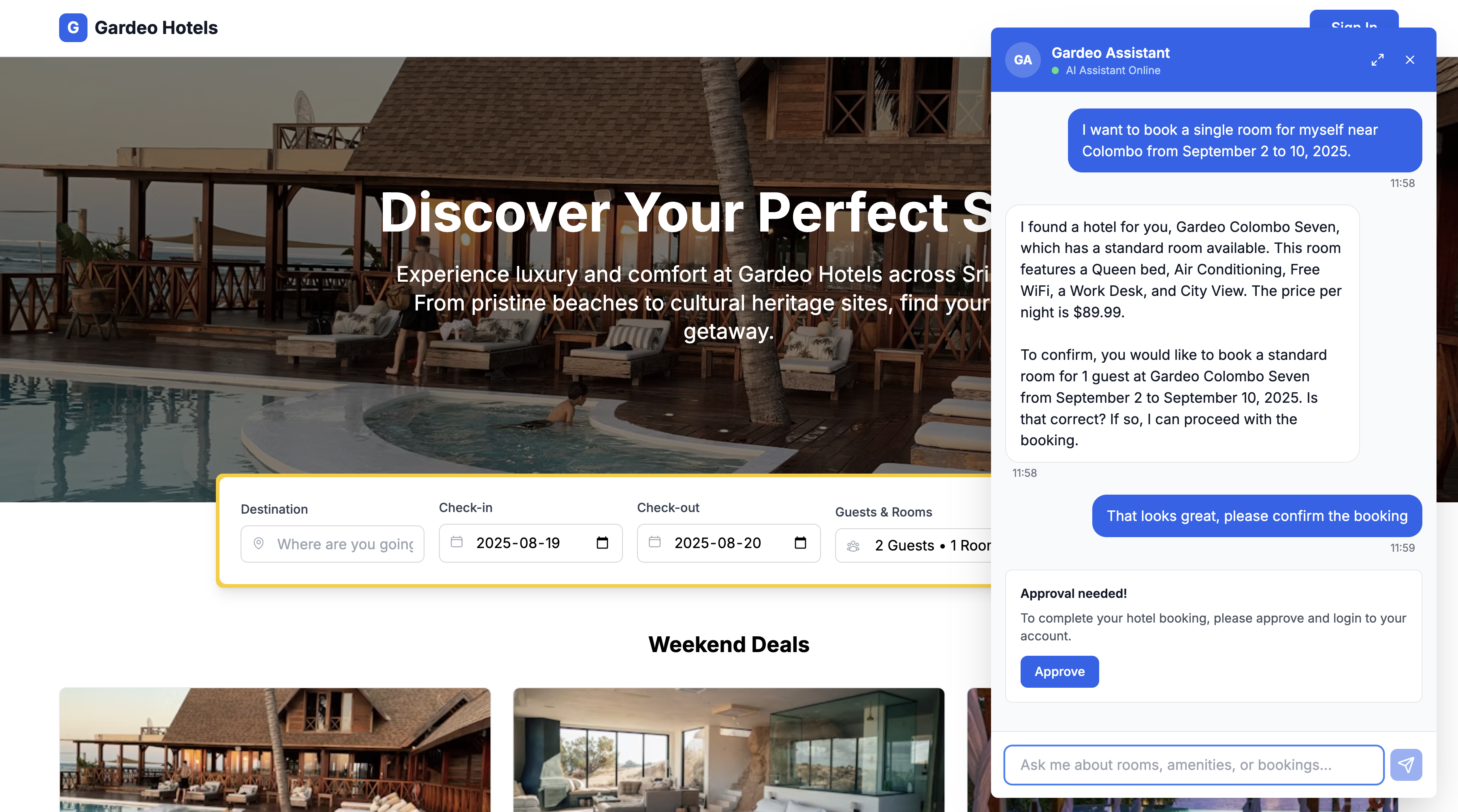 Interact with the application to see the security flows in action. This scenario walks you through booking a room with the assistant agent's help and triggering the autonomous agent.