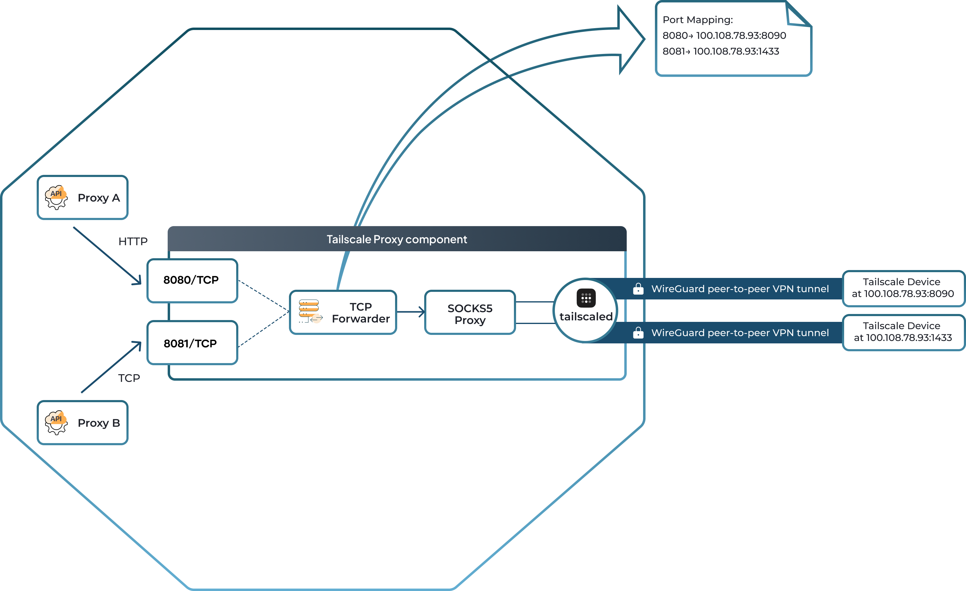 API proxies within the same project as the Tailscale proxy can send their traffic to the ports exposed on the Tailscale proxy. The Tailscale proxy then forwards this traffic to the correct target node and IP address in your Tailscale network that is defined in the port mapping of the endpoint configuration