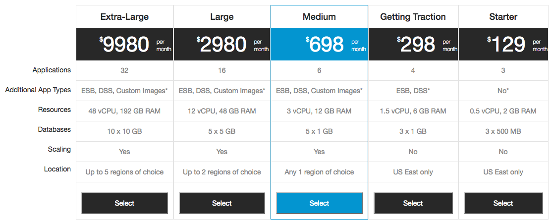 - Extra-Large is the enterprise package that lets you scale up to 32 applications, 192 GB of RAM, and 10 databases 10 GB each.