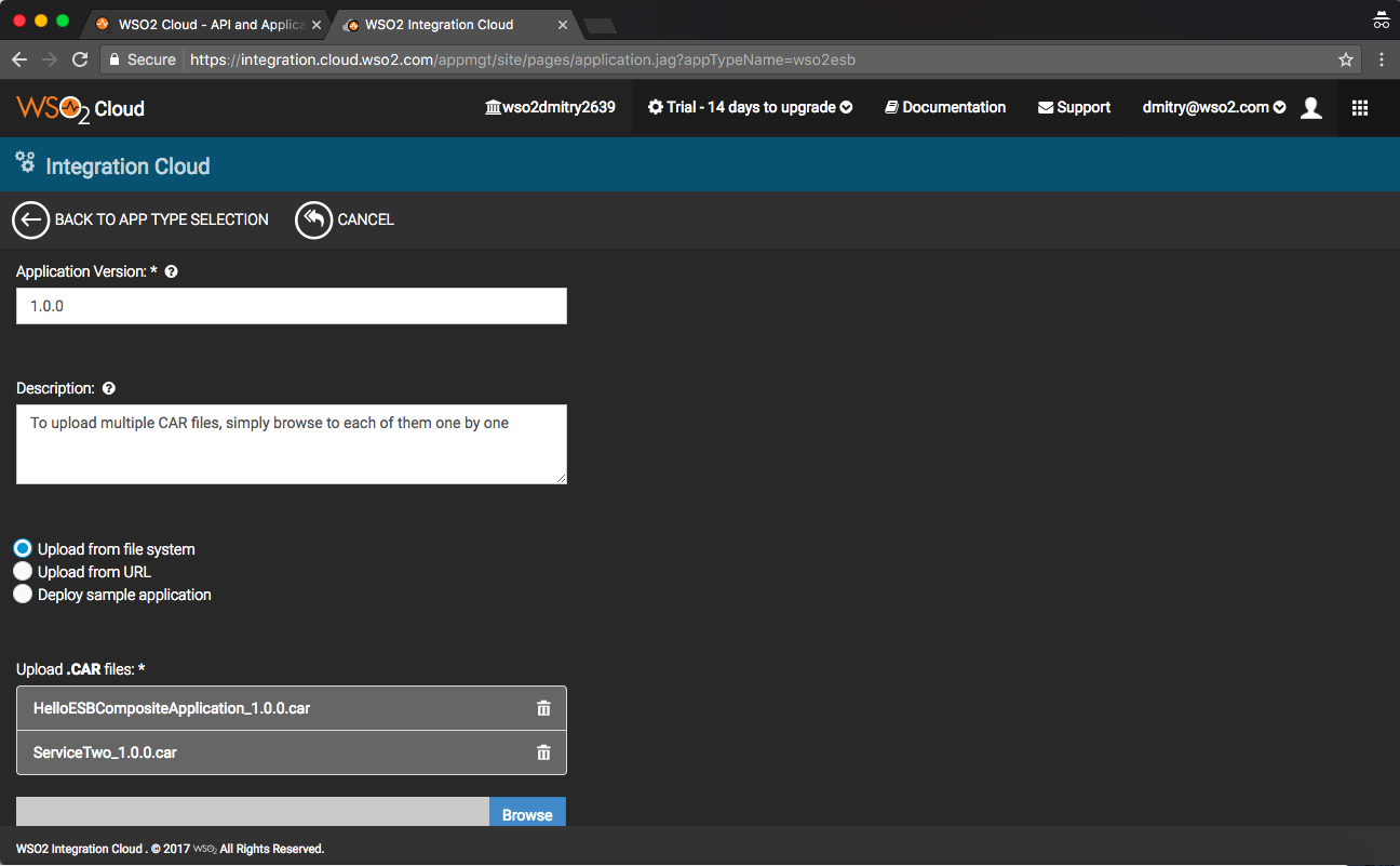 When you create a new ESB app or a new version of an existing app in Integration Cloud and you have multiple CAR files, simply browse to each of them one at a time, and the system will get all of them uploaded and added to the runtime: