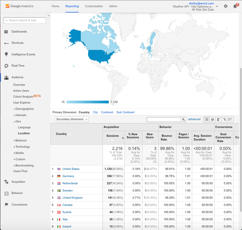 We have added geographic reporting support to API Cloud's Google Analytics integration. Now if you integrate your API with your Google Analytics account as described here, your Audience / Geo / Location report will tell you where your API users are coming from: