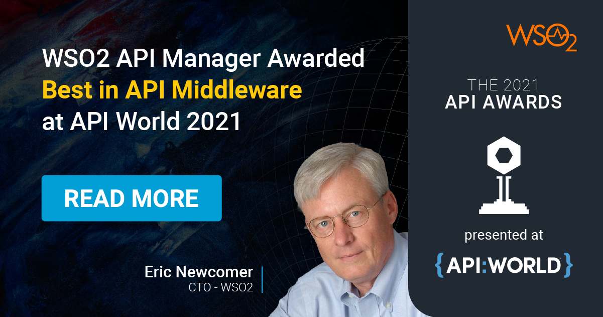 WSO2 API Manager (APIM) has won the Best in API Middleware award at the 2021 API Awards, held at API World 2021.