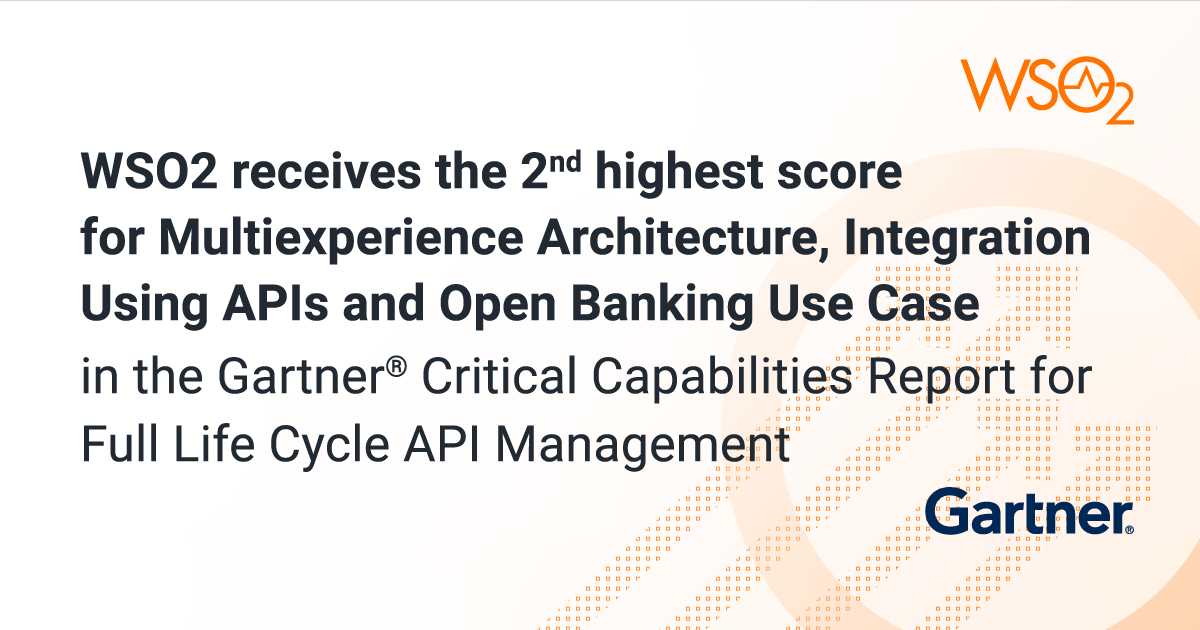 WSO2 has once again been identified by Gartner as a Visionary in the 2021 Gartner® Magic Quadrant for Full Life Cycle API Management [1]. While the evaluation focuses on completeness of vision and ability to execute, we believe our scores in the 2021 Gartner® Critical Capabilities for Full Life Cycle API Management [2] further support the initiatives we are taking to provide deep platform capabilities to integrate legacy systems and work with new event-driven architectures. We also see it as a testament to the product’s strengths in addressing the real-world demands of today’s enterprises. You can download the full report here.