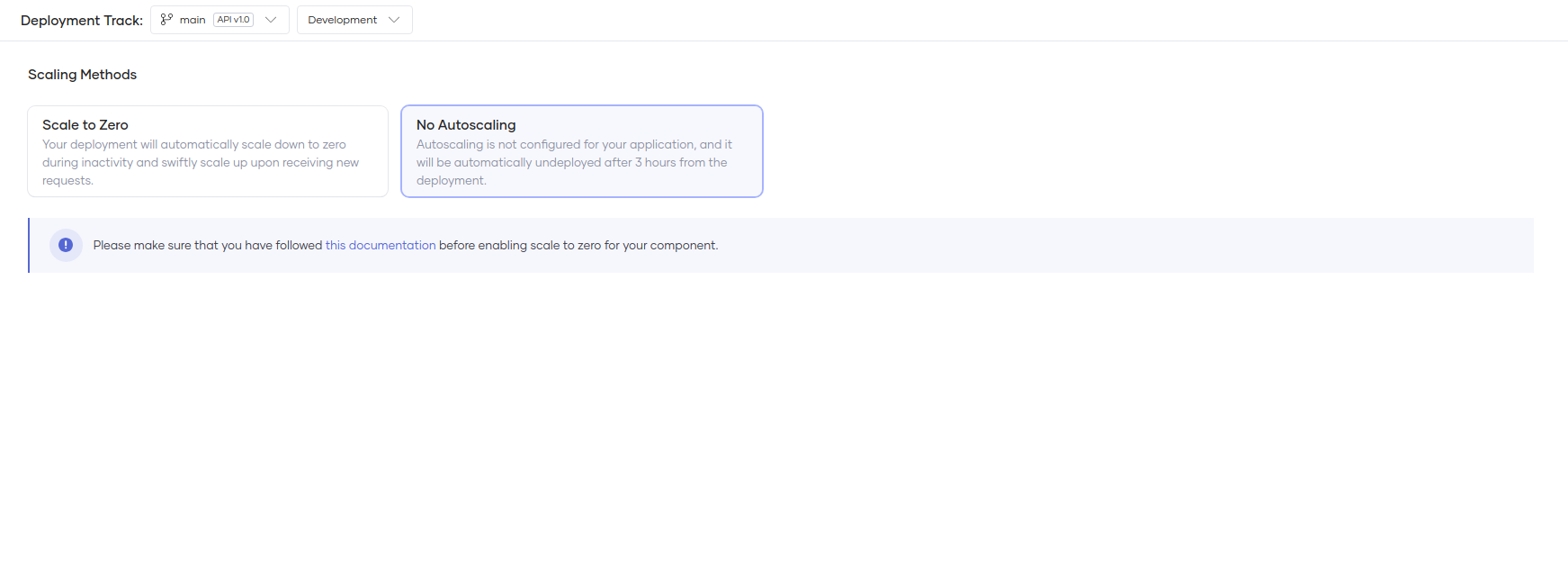 You can independently scale Choreo components in both the Development and Production environments. The deployment card indicates the scaling status of each environment. To configure the scale-to-zero feature for a specific environment, click on the scale-to-zero link, which redirects to the K8s Operations → Scaling page.