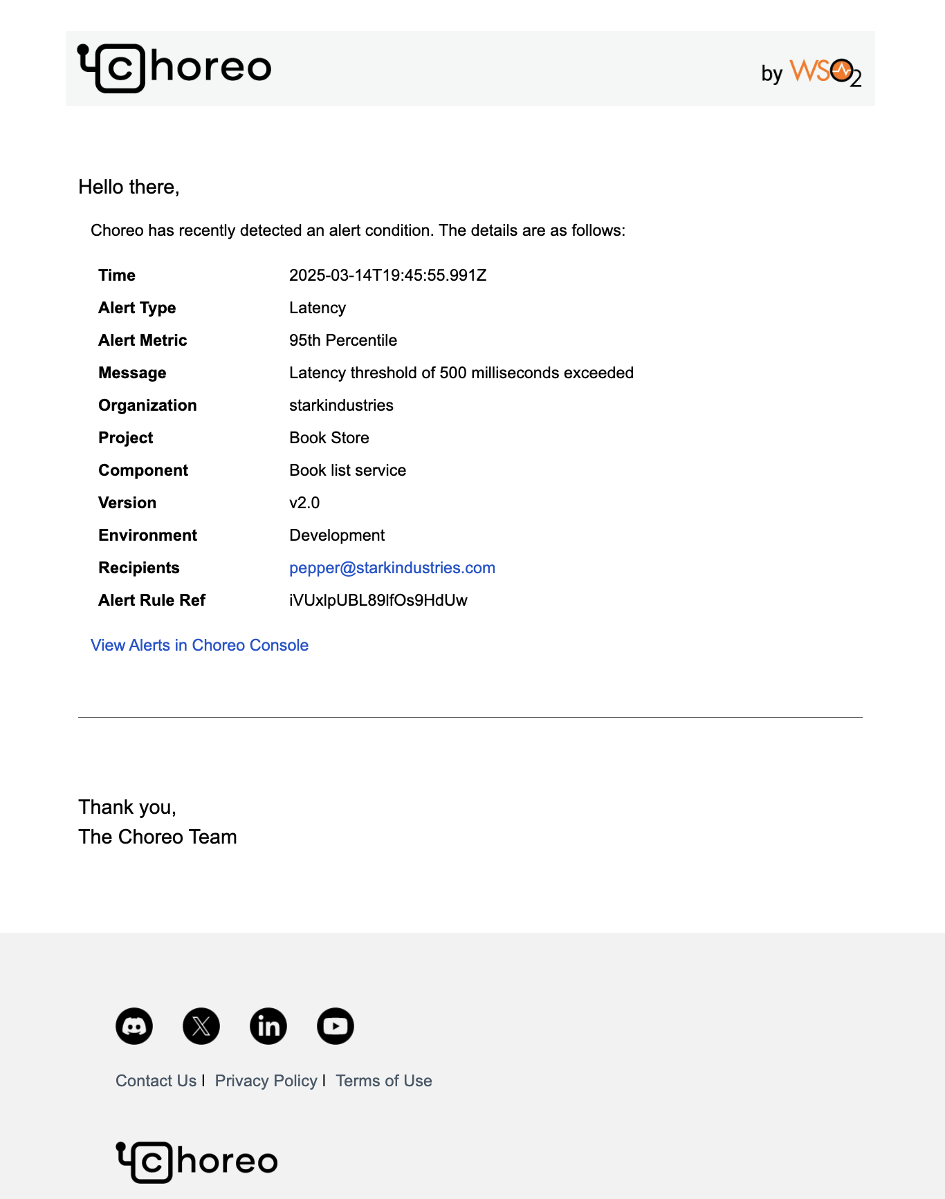 When an alert is triggered, recipients added to the alert rule receive an email with alert details including a direct Alert View link to Choreo console.