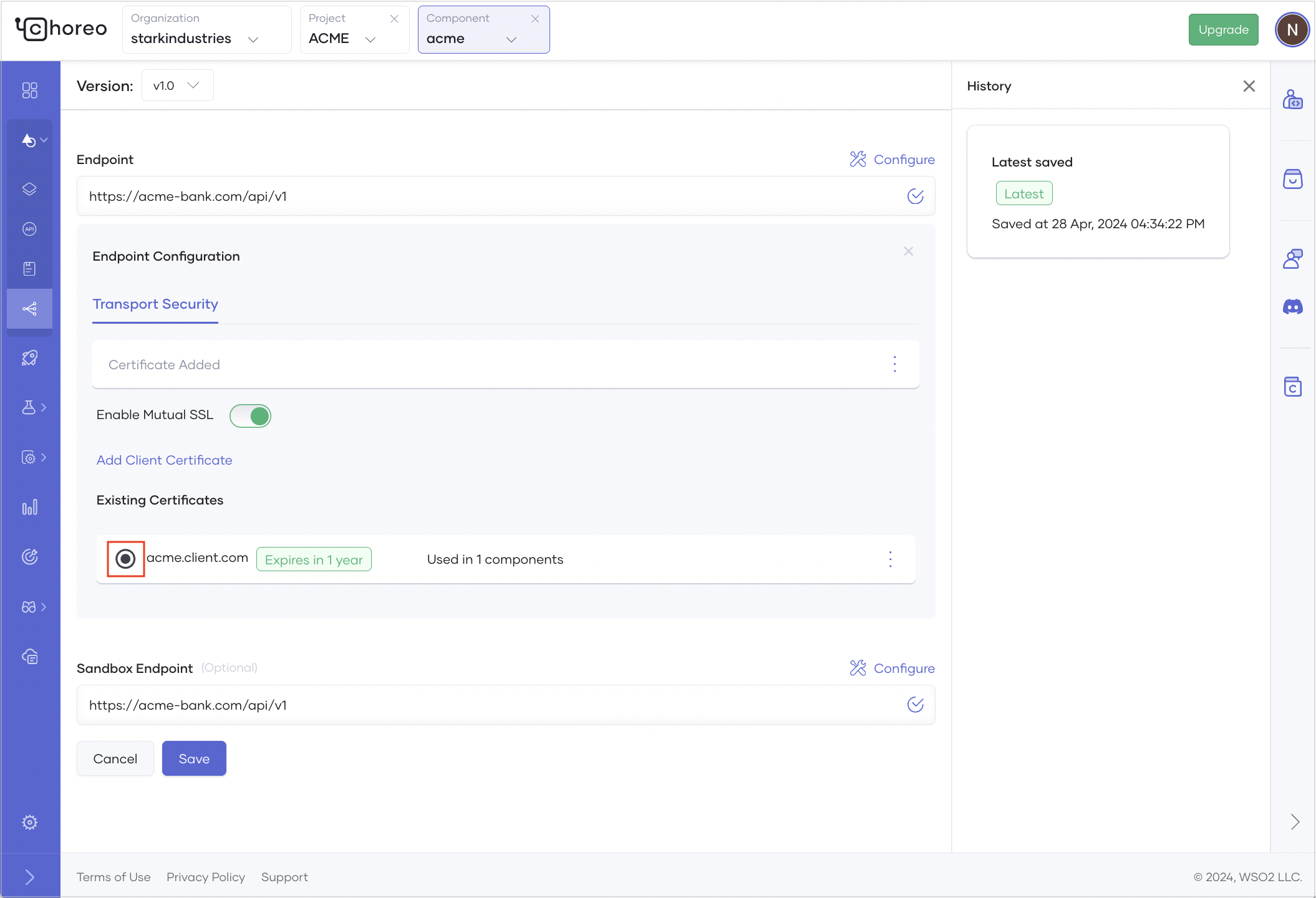 - Select the backend certificate from the Endpoint Certificate dropdown. This lists all certificates available at the organization level. The selected certificate applies to all environments as the default for the endpoint. You can override this certificate if necessary when you deploy or promote the API.