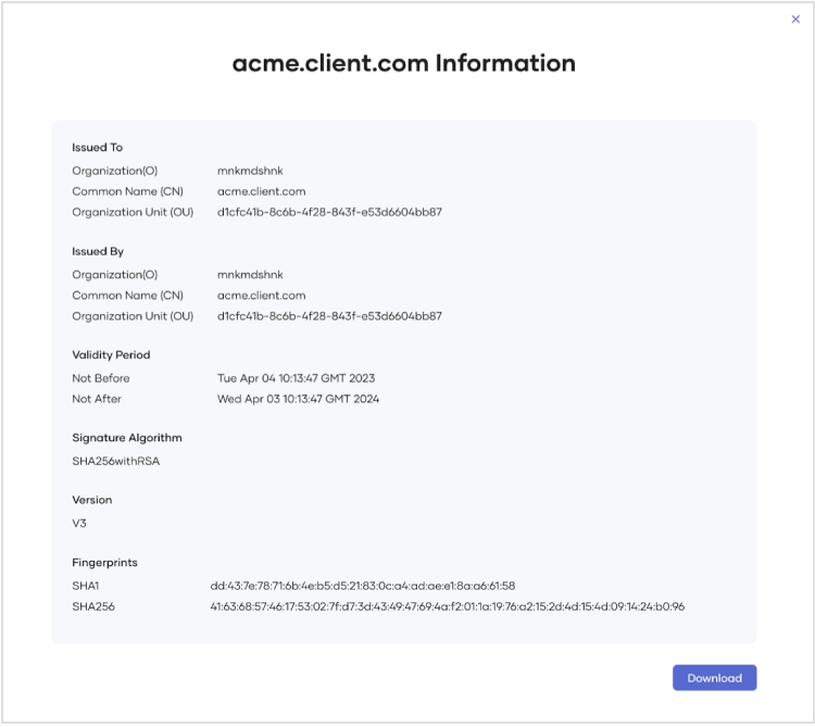 To download the certificate in PEM format, click Download. You can add this certificate as a trusted certificate in the API backend server.