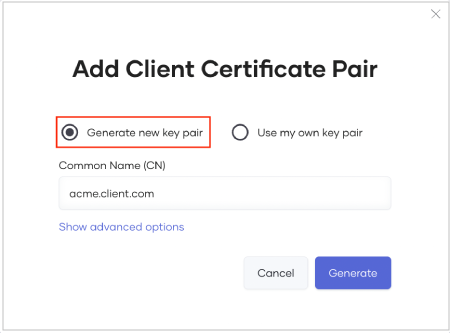 In the Add Client Certificate Pair dialog, select Generate new key pair and specify a value as the common name for the certificate pair. This value will be used to identify the certificate.
