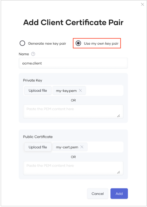 In the Add Client Certificate Pair dialog, select Use my own key pair.