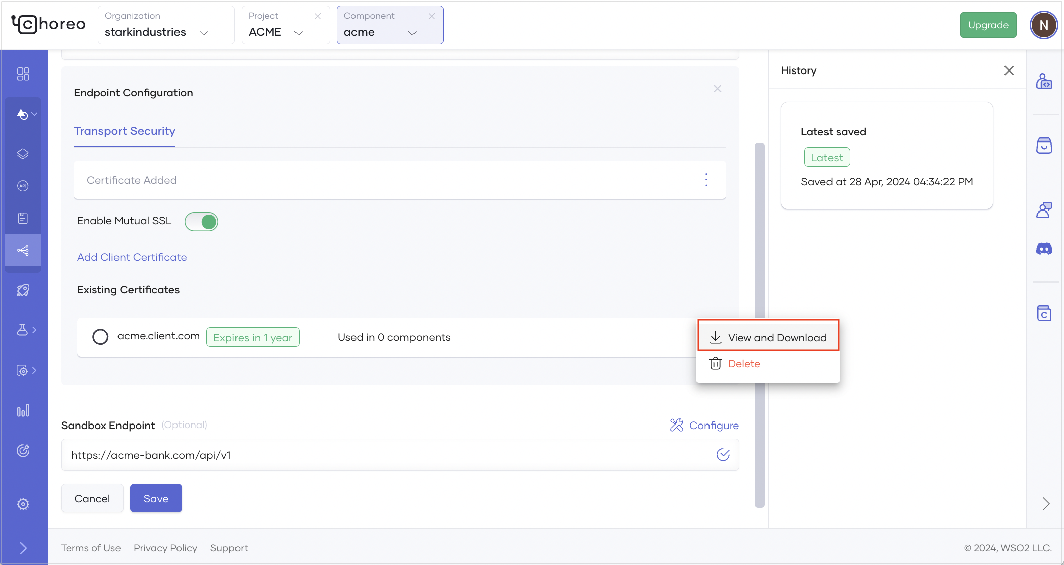 When you follow these steps, WSO2 Developer Platform generates a key pair with a self-signed certificate. You can attach this key pair to any API proxy created within the same project.