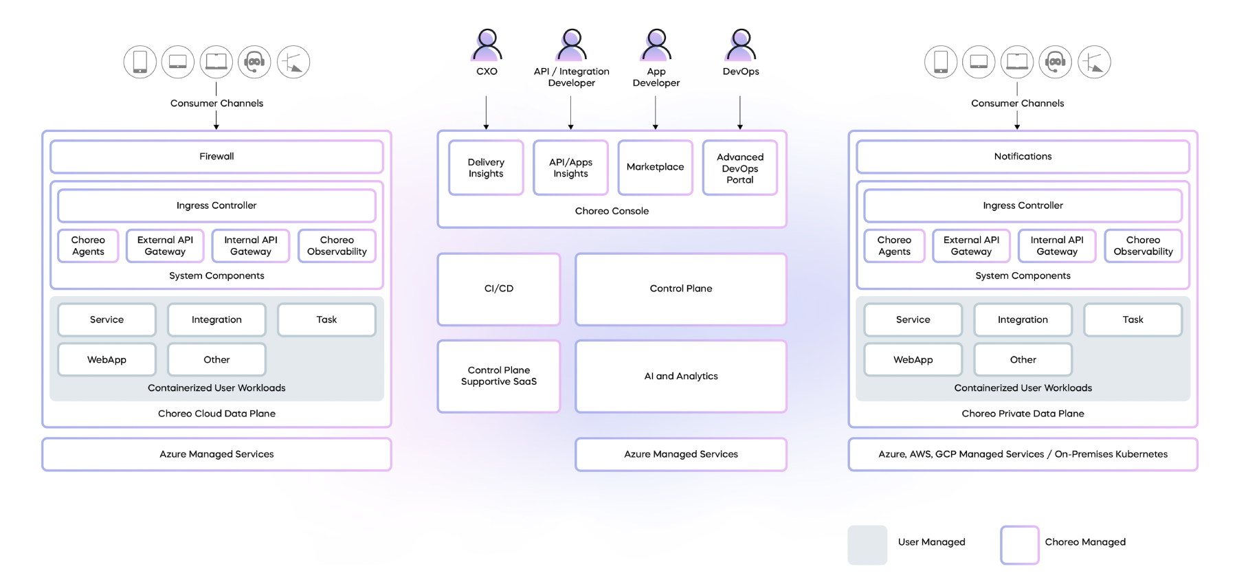 WSO2 Developer Platform's architecture comprises two key components: the control plane and the data plane. The control plane handles essential tasks such as administering organizations, users, and projects. In addition, it also governs the entire journey of application development, from the initial stages of creation, progressing to deployment, including measures to enforce governance and the provision for observability. The WSO2 Developer Platform control plane is a SaaS that manages all cloud data planes and private data planes. It caters to diverse user personas, including CIOs, architects, and developers, as well as DevOps, site reliability engineers, and platform engineers.