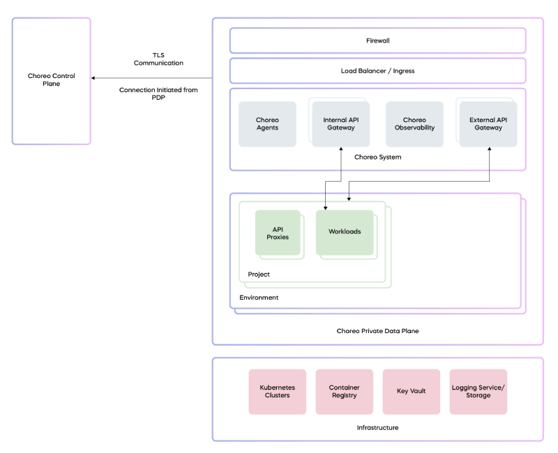 WSO2 Developer Platform's architecture features two distinct data plane types: cloud data planes and private data planes. A cloud data plane utilizes a multi-tenanted infrastructure model for deploying user applications, creating a shared yet secure environment for application runtime. In contrast, a private data plane(PDP) provides dedicated infrastructure for a single organization to run its user applications. This ensures an added layer of privacy and control for organizations with specific requirements.