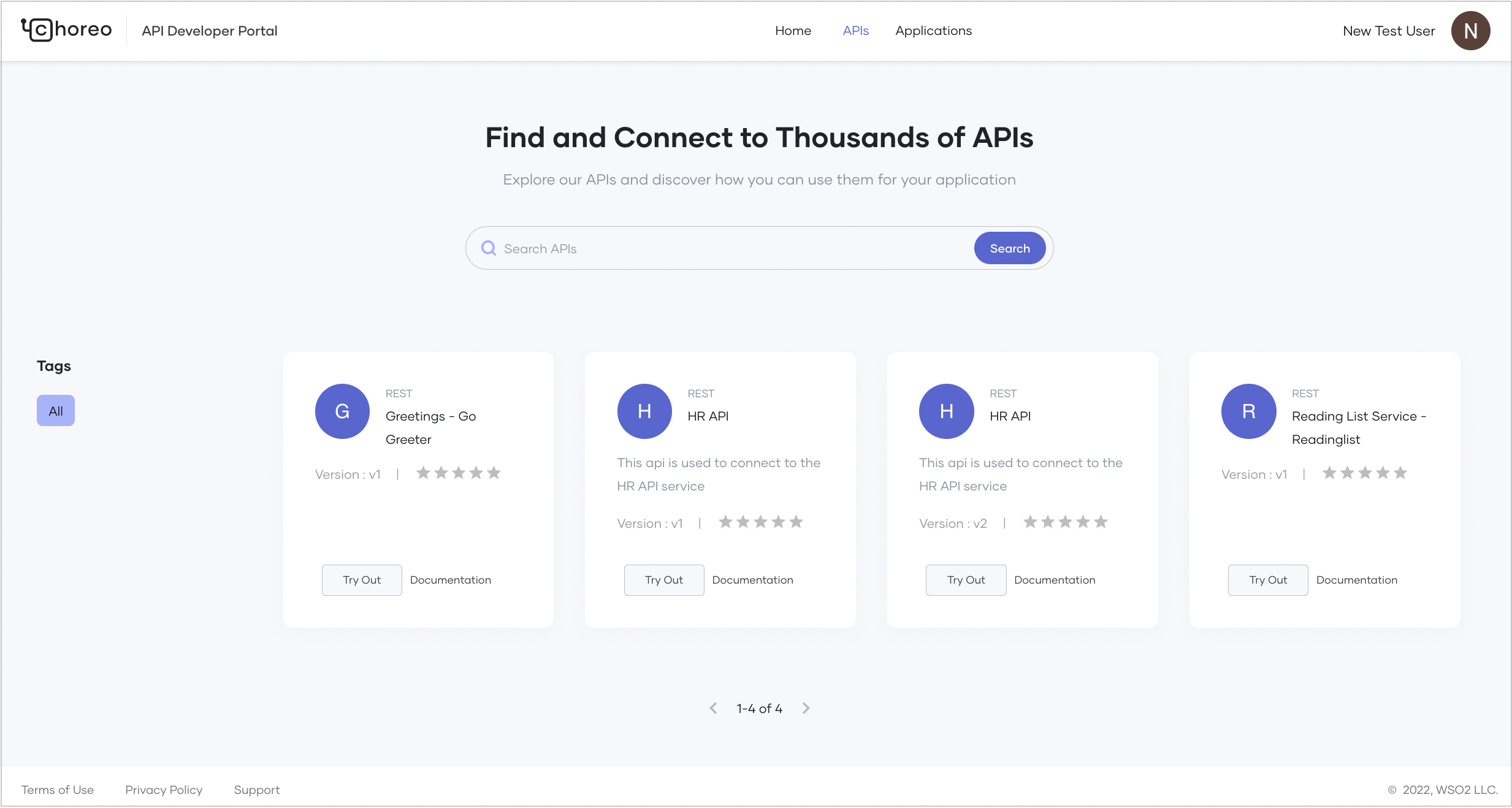 In the WSO2 Developer Platform Developer Portal, developers can search for APIs by name. APIs and services created and published through the WSO2 Developer Platform Console are visible in the Developer Portal based on their visibility settings: