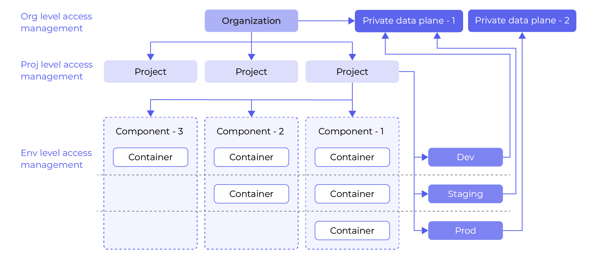 Data planes are connected to the organization and are available for all projects within the organization. When you create an environment in a project, the data plane connected to the organization is linked with an automatically generated Kubernetes namespace.