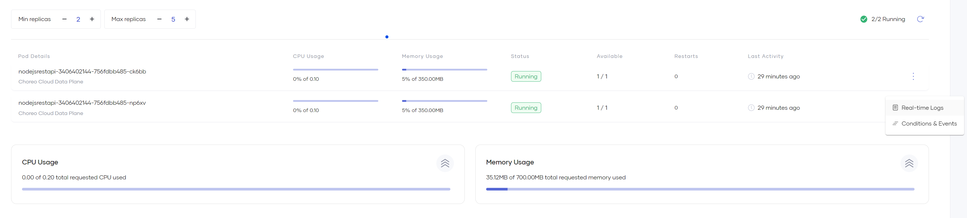 If you want to see the real-time logs and information on conditions and events of a replica, click the menu icon of the replica and then click Real-time Logs or Conditions & Events depending on what you need to view. These options provide insights that help to diagnose issues in deployments.