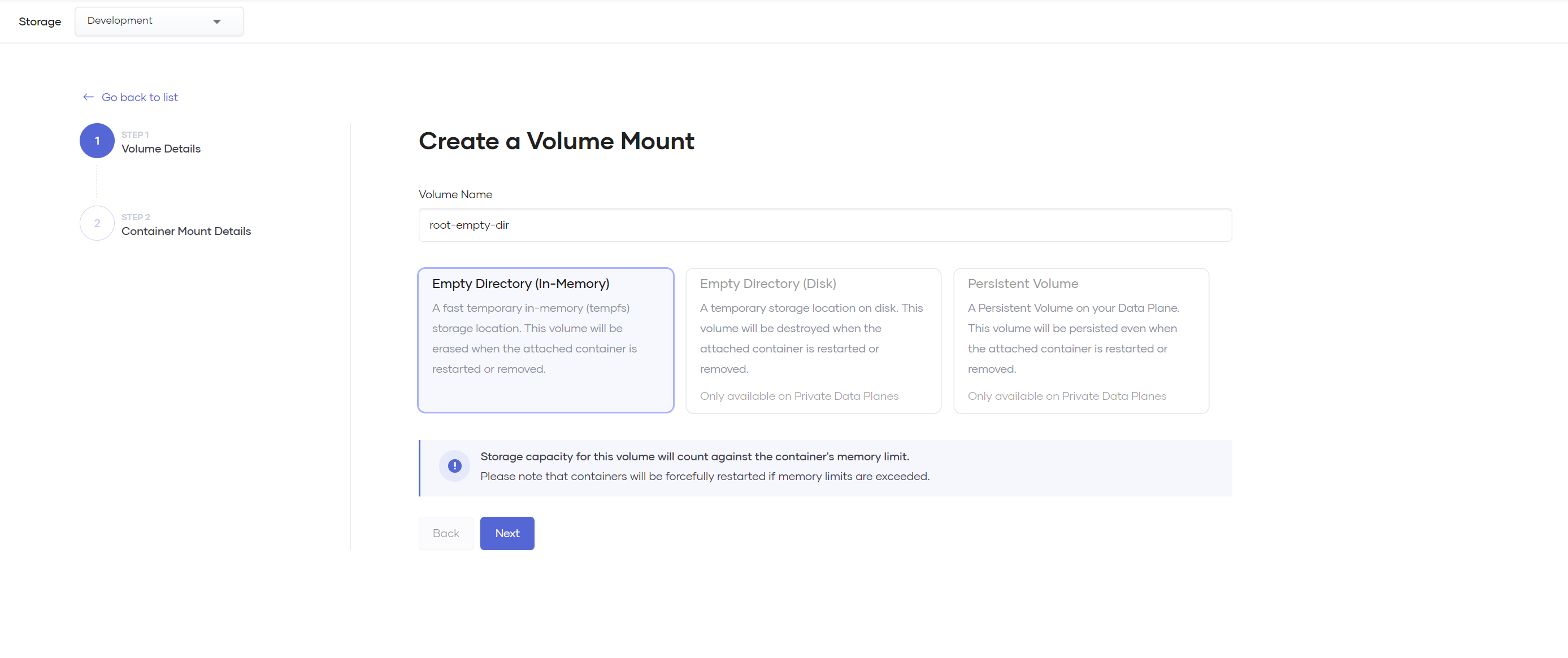| Empty Directory (In-Memory) | A fast, temporary in-memory (tmpfs) storage location. This volume gets erased when you restart or remove the attached container. Available on all data planes. |